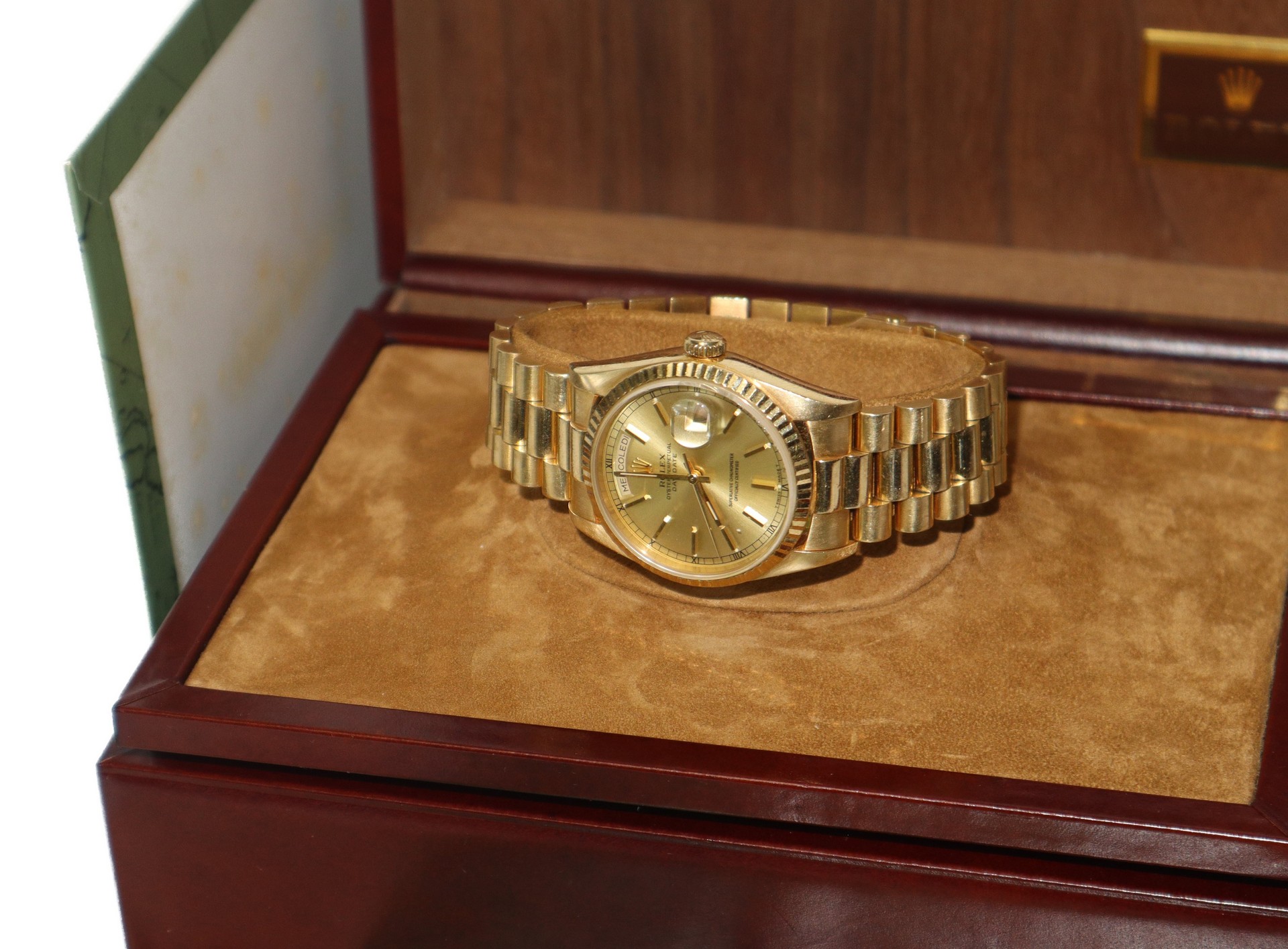 Rolex - Orologio Rolex modello Day-date in oro giallo 18 kt cassa 36 mm Oyster perpetual day-date. 1992. Dotato di scatola e controscatola, certificato con garanzia di autenticità, calendario , portadocumenti con logo, panno con logo.