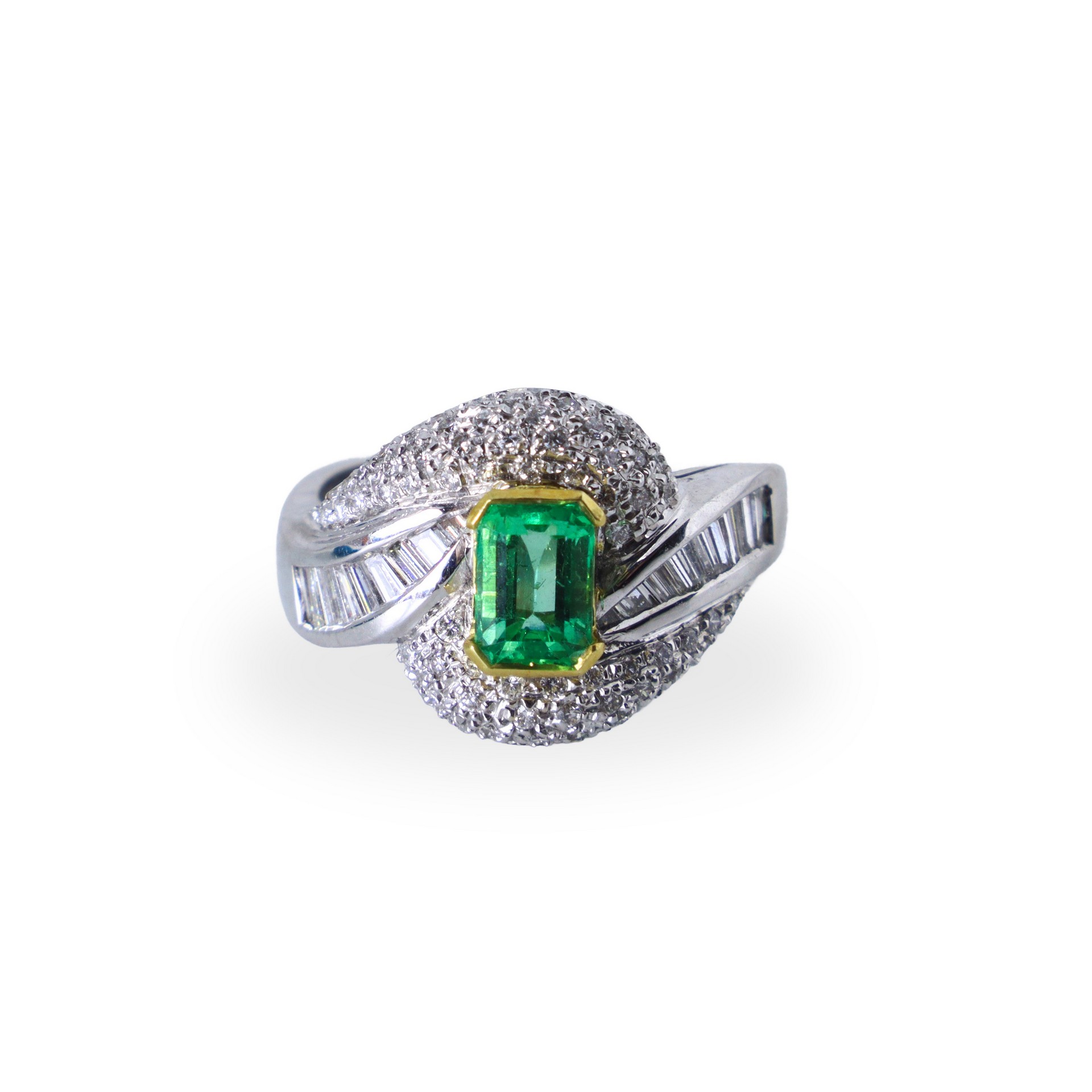 Anello in oro bianco con diamanti taglio brillante e baguette e smeraldo colombiano Gr 8,80 Smeraldo kt 0,81 brillanti 1,39