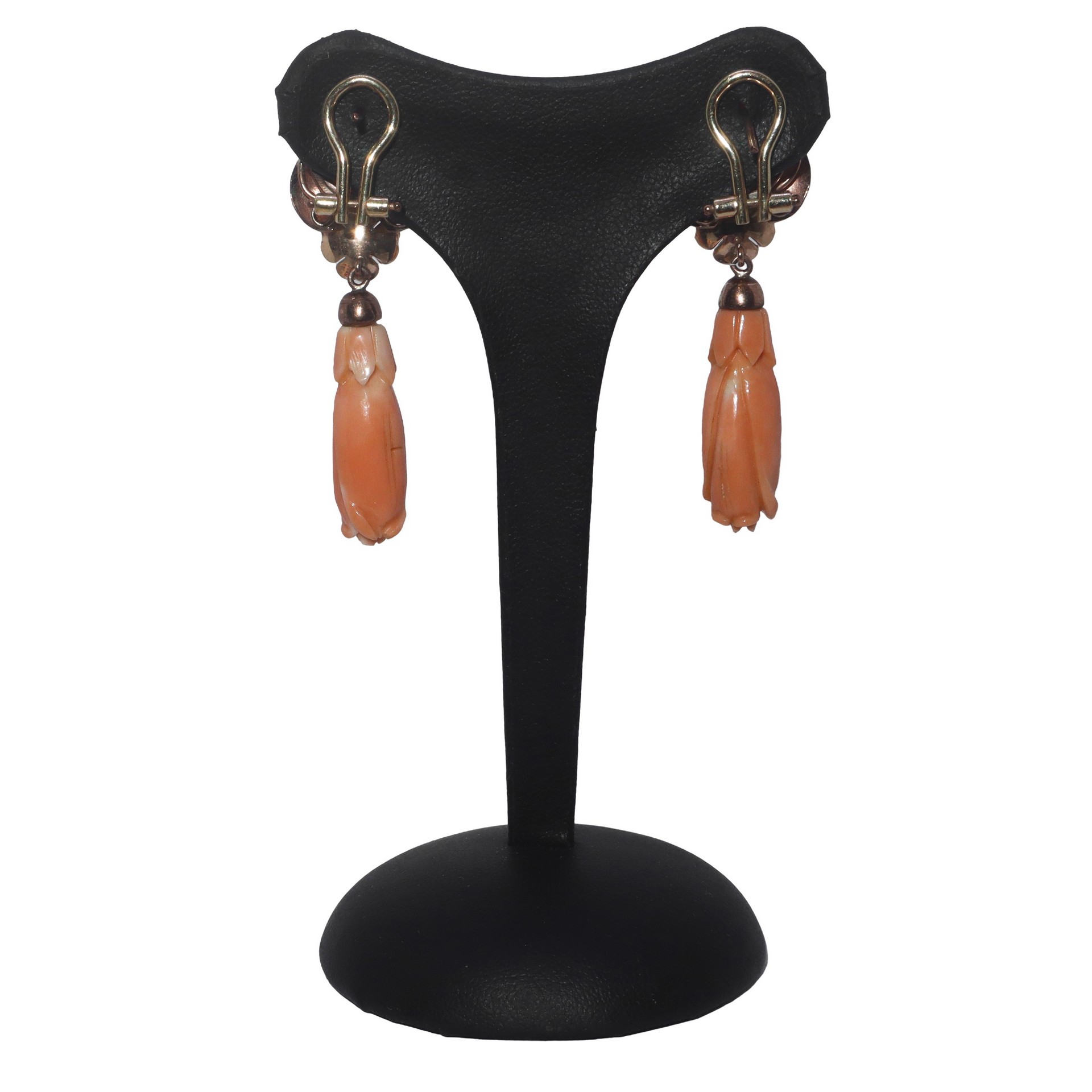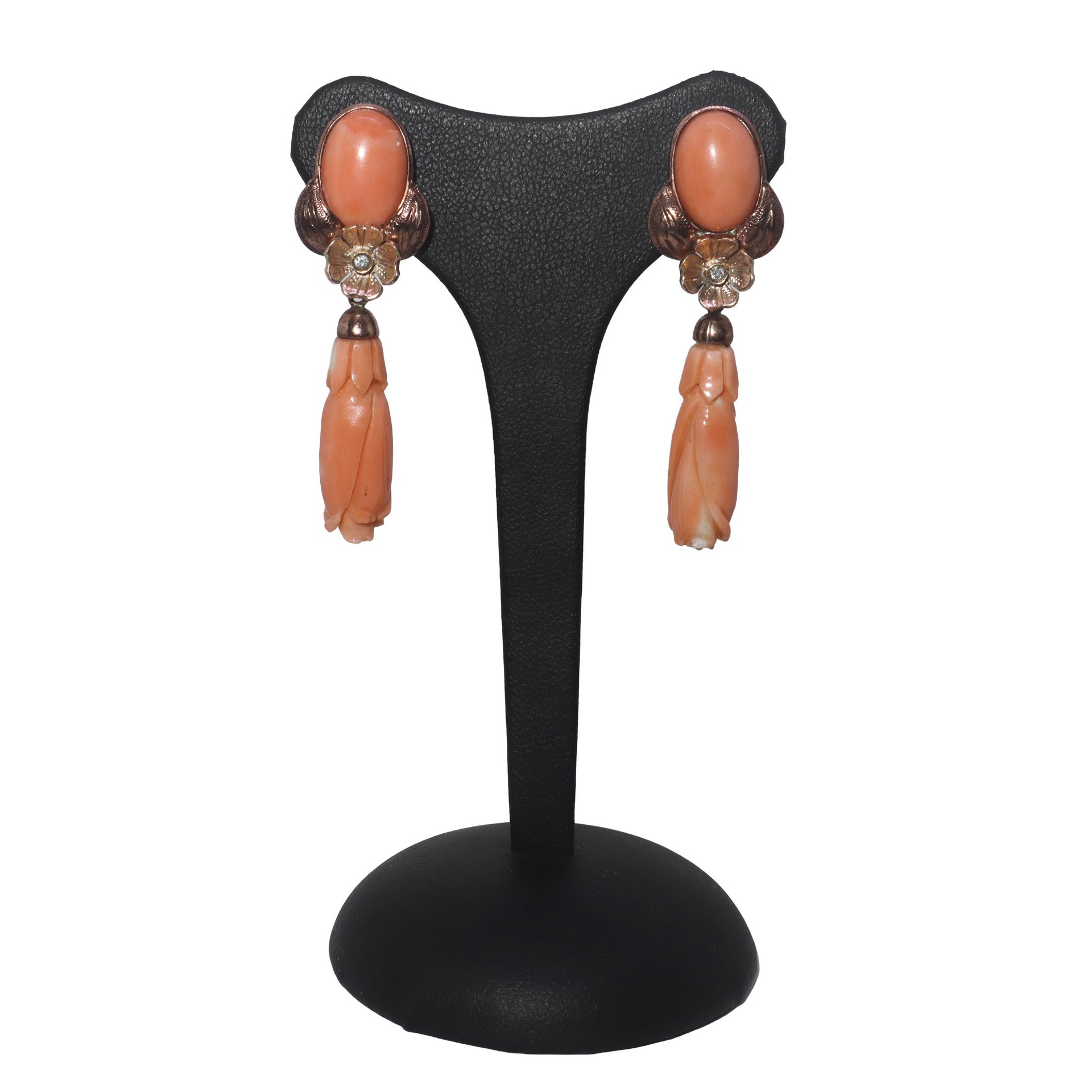 Orecchini a clip pendenti in oro a basso titolo e corallo rosa a fiore gr 7,5 cm 2