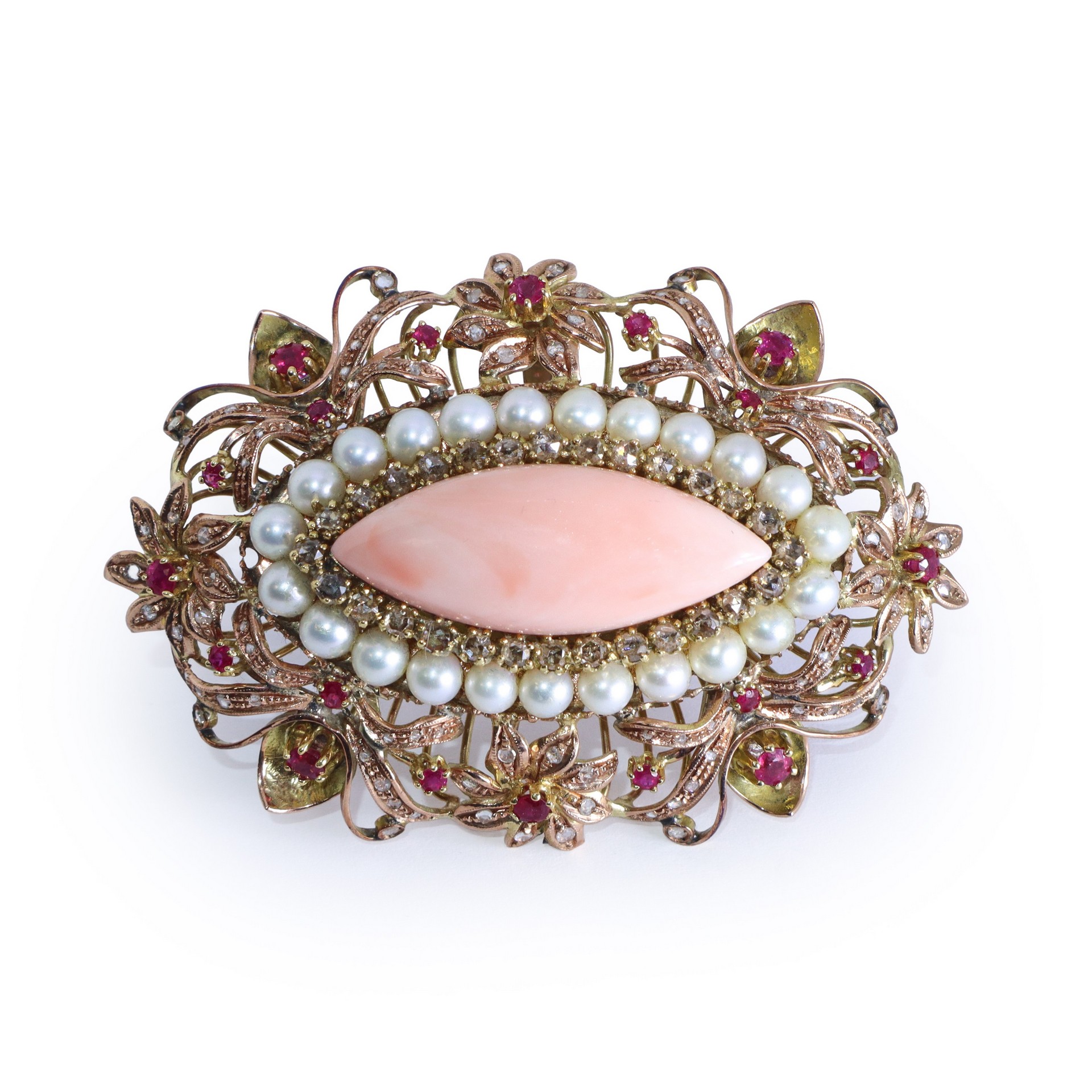 Lotto 109 | Spilla in argento vermeil con corallo rosa e diamanti
