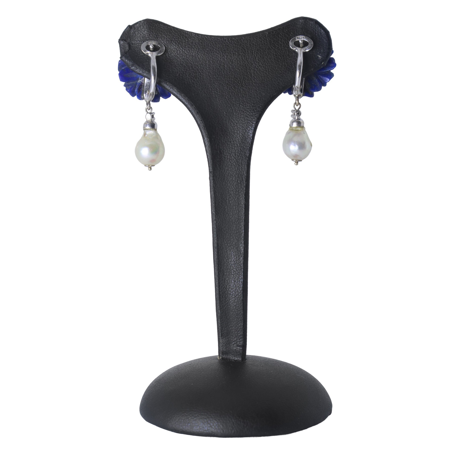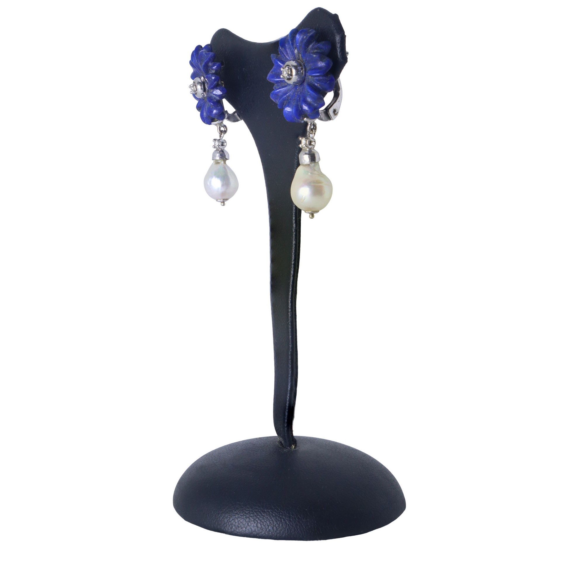 Orecchini in oro bianco 750 a forma di fiore in lapislazzulo con diamante centrale e perla pendente cm 3,5 gr. (pietre incluse) 8,8