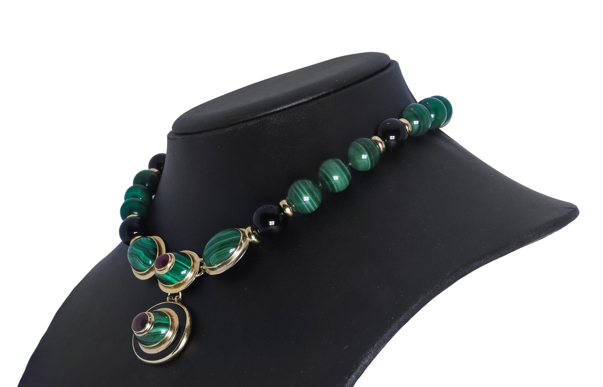 Parure in oro giallo 14 kt, malachite, onice e granati composta da collana e orecchini pendenti