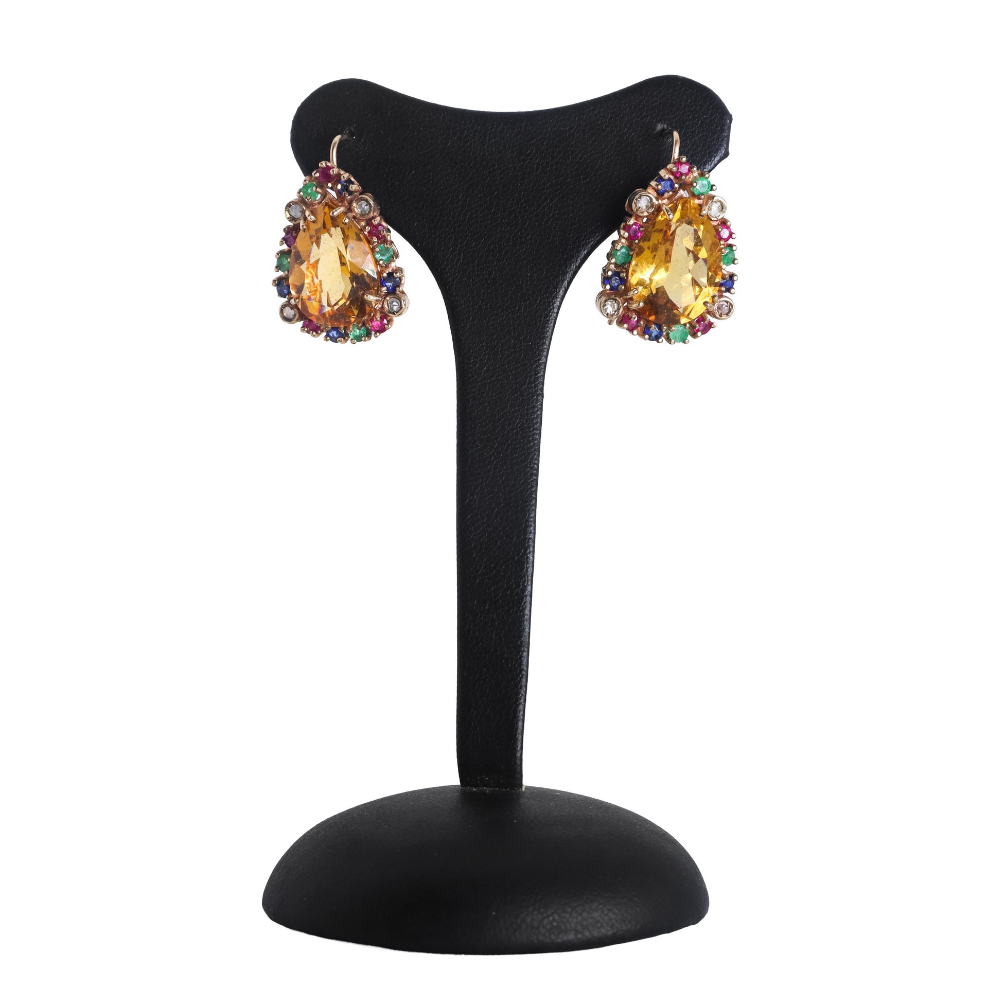 Orecchini a goccia in oro giallo 9 kt con quarzo centrale e cornice di pietre naturali intorno cm 2,5 gr. (pietre incluse) 12,5 Punzone 375