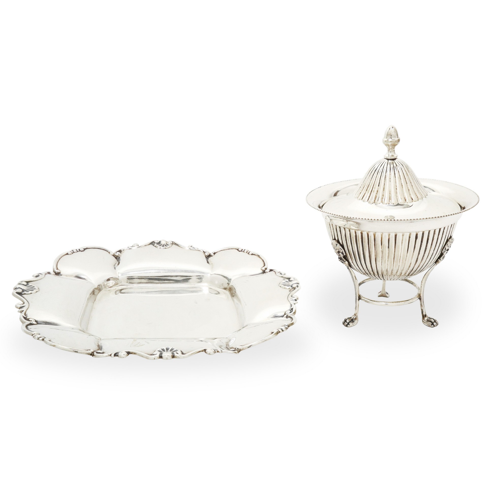 Lotto 208 | Zuccheriera in argento 800 con piedi felini e svuotatasche in argento 800 con bordo smerlato in argento 800