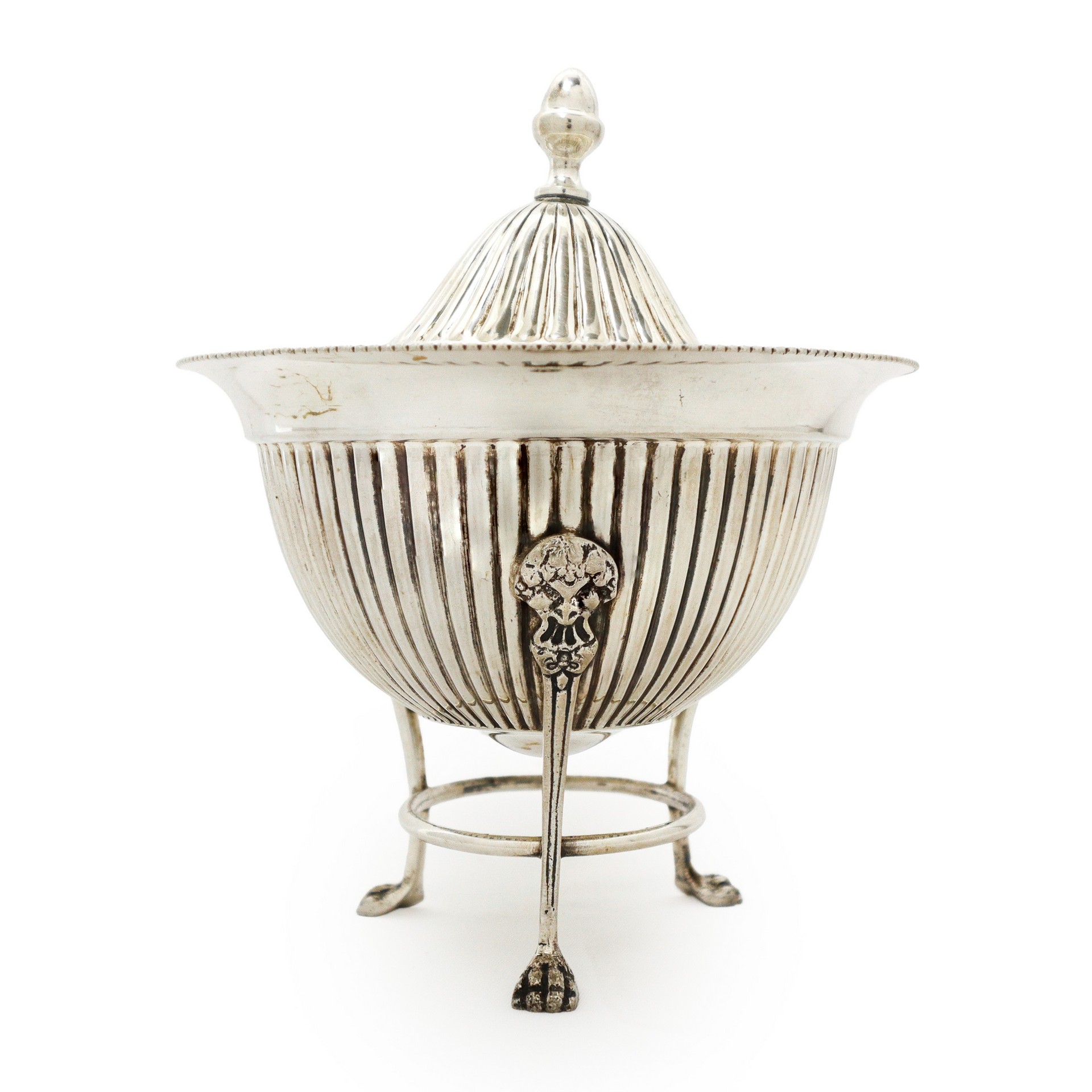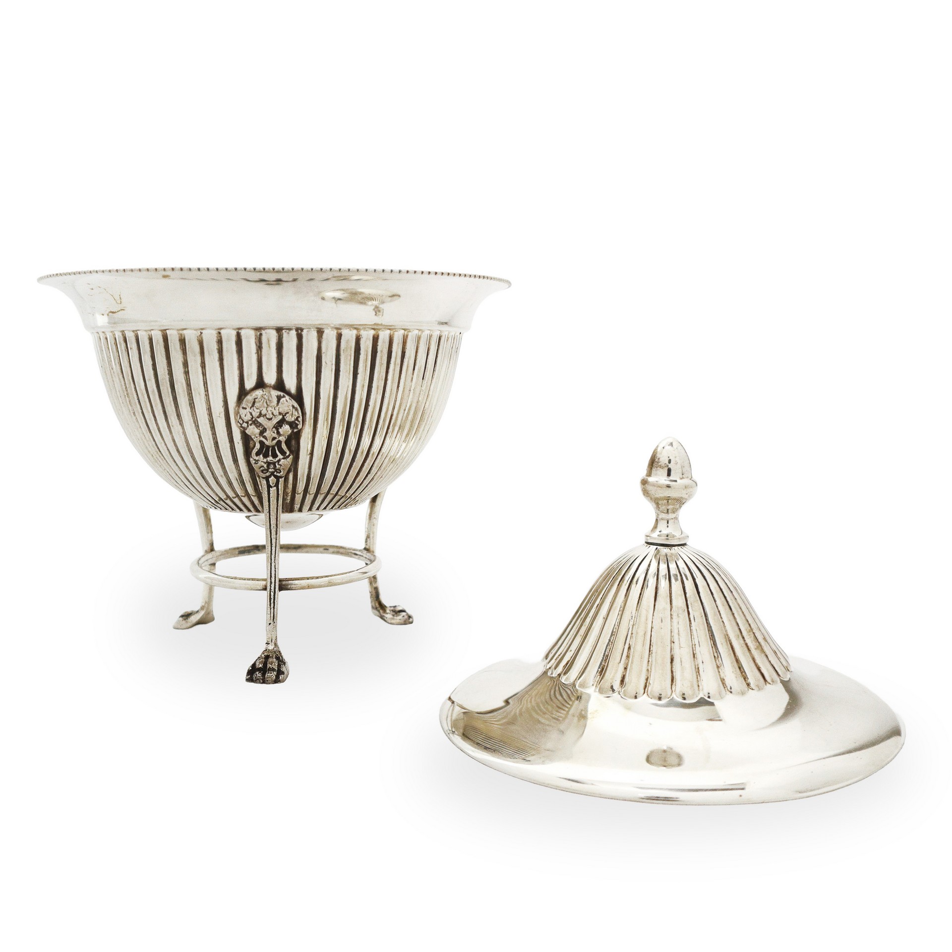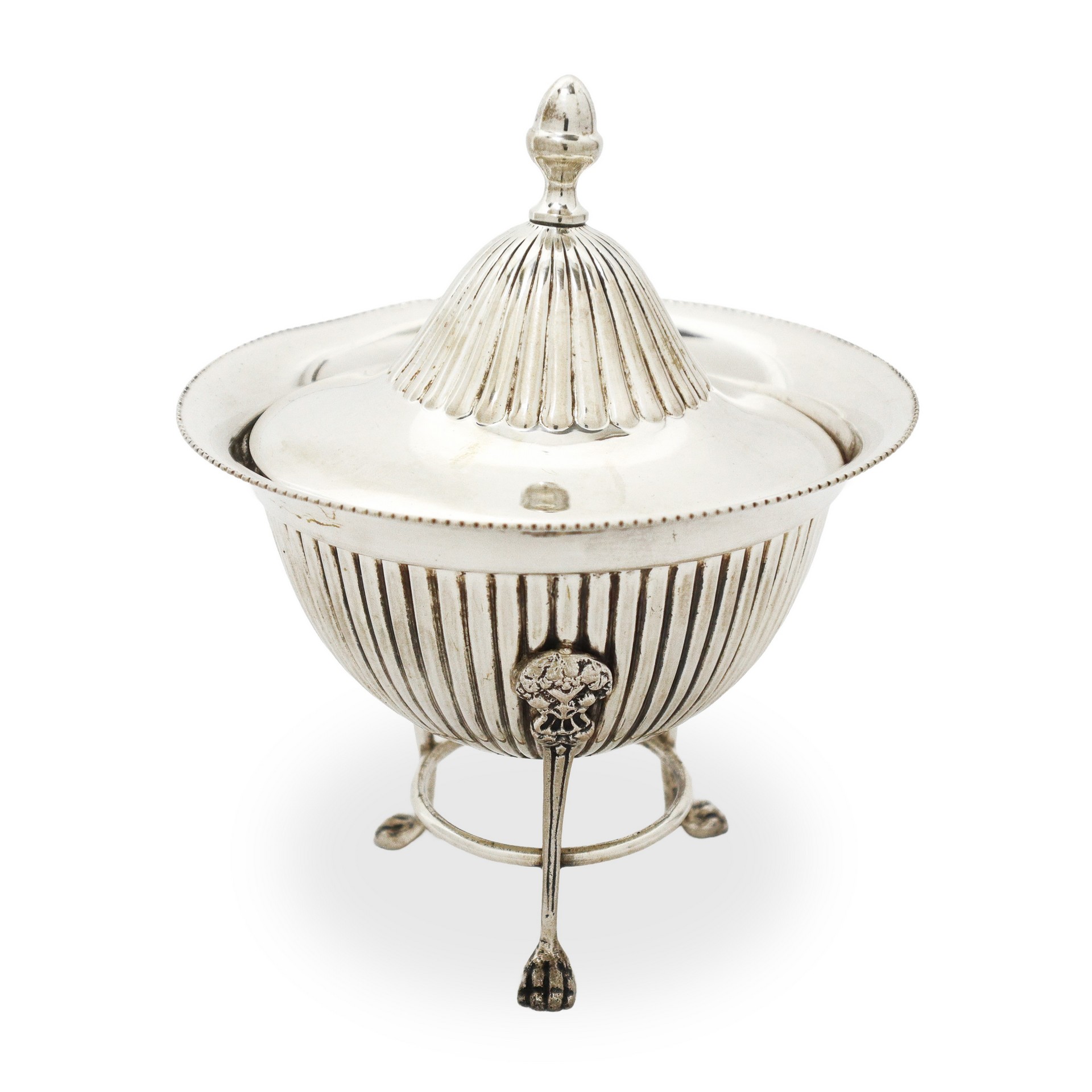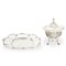 Zuccheriera in argento 800 con piedi felini e svuotatasche in argento 800 con bordo smerlato in argento 800