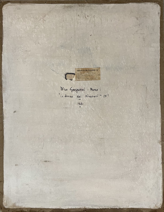 GASPARRI NINO (1910 - 1989) LE DONNE DEI MINATORI. 1951. Olio su cartone. Cm 71,00 x 92,00. sul retro: anno ed etichetta espositiva "Mostra Naz. di Pittura di Città di Messina" del 1951.