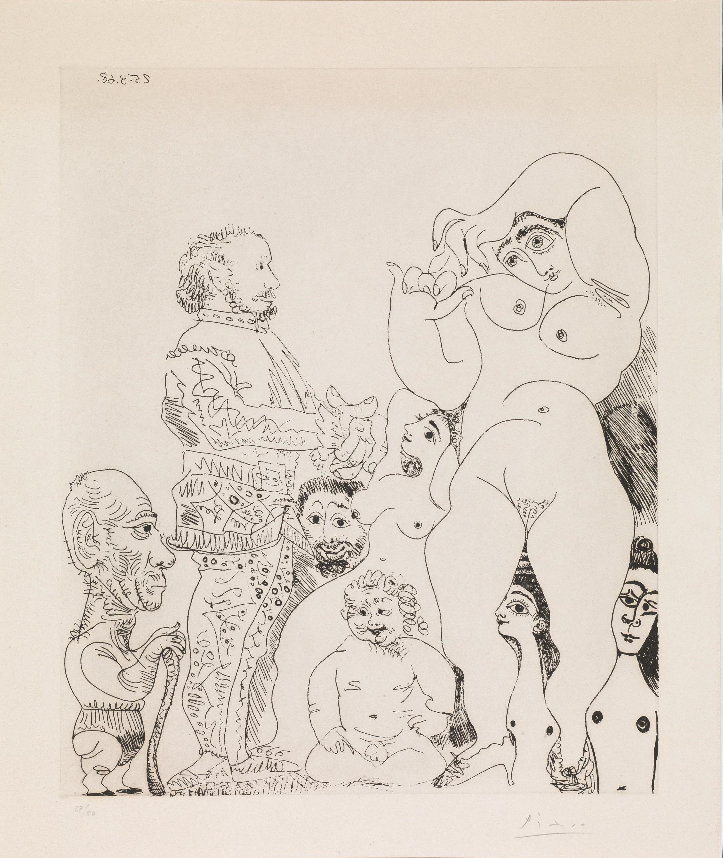 Pablo Picasso (Màlaga 1881 - Mougins 1973) SENZA TITOLO acquaforte, battuta cm 42,5x34,5 su foglio cm 56x47,5; es. 37/50 firmato e numerato eseguito nel 1968 Provenienza: Collezione privata, Milano Bibliografia: Georges Bloch, Pablo Picasso. Catalogue de l'oeuvre gravé et litographié 1966-1969, vol. II, Berna 1977, p. 107, tav. 1488