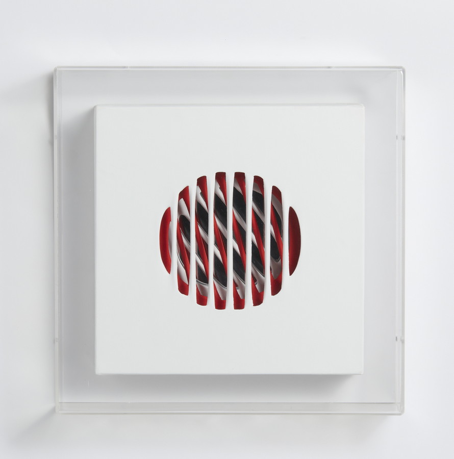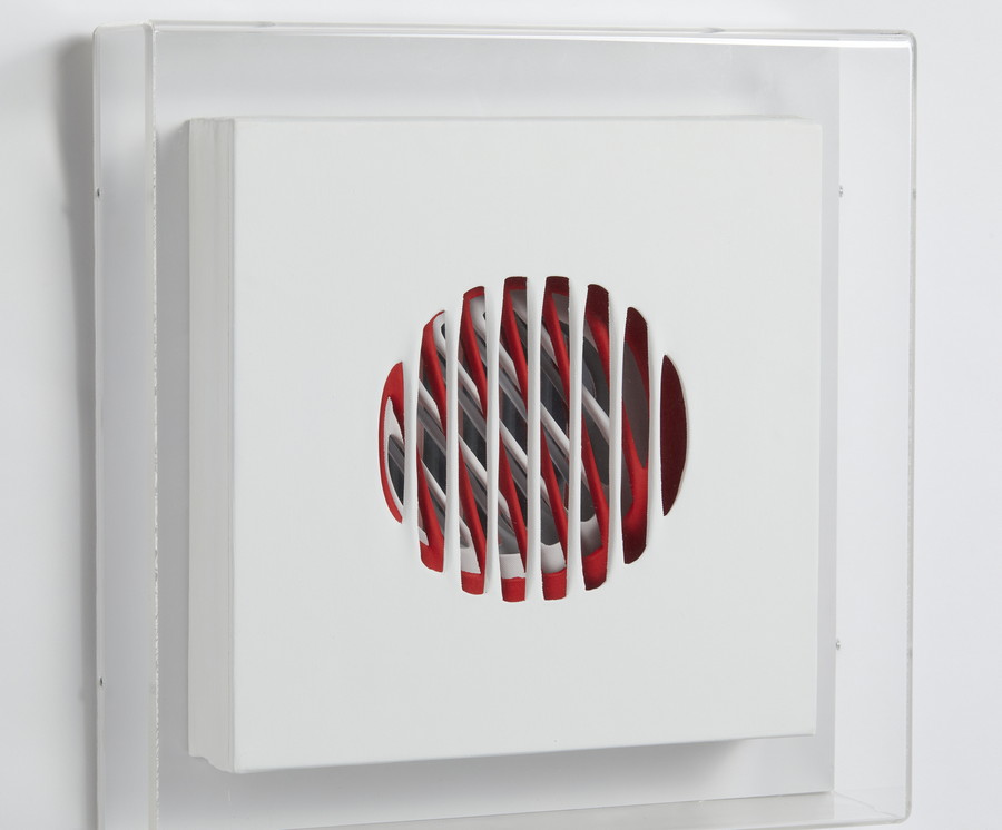 NICOLOTTI VANNA (n. 1929) STRUTTURA TRIPLA VARIATA. 2009. Tela intagliata e dipinta di bianco, rosso e metallo speculare. Cm 30,00 x 30,00. sul retro: firma ed etichetta dell'artista