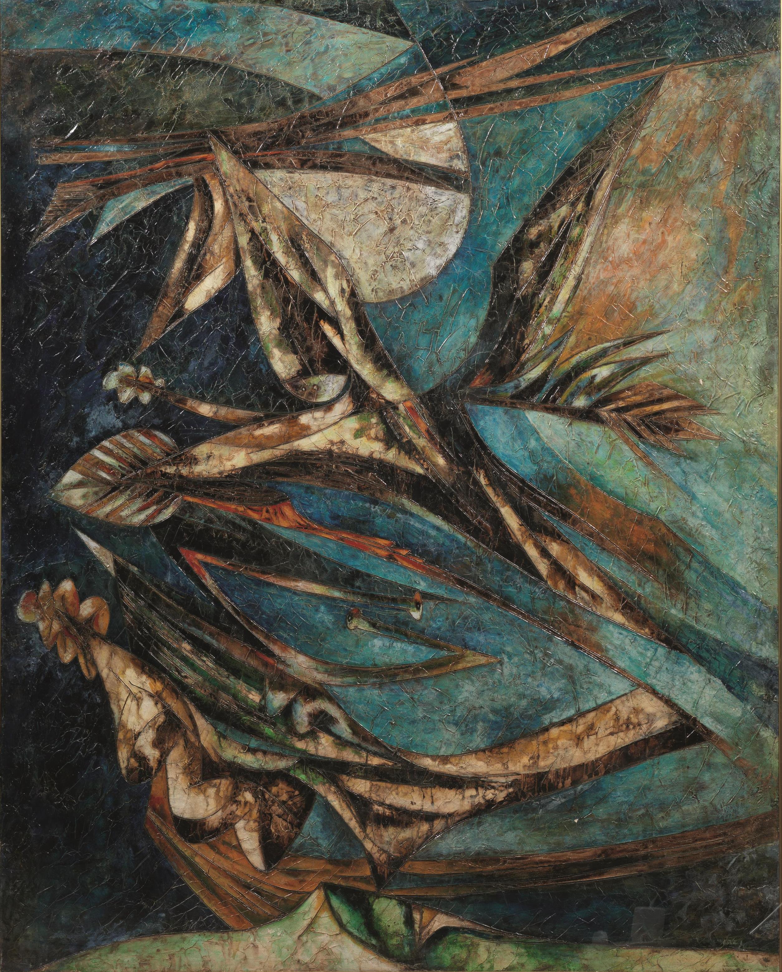 Gianni Dova (Roma 1925 - Pisa 1991) UCCELLO CONTRO LUNA olio su carta applicata tela, cm 163x130 firmato Provenienza: Galleria Michaux, Firenze Collezione privata, Milano