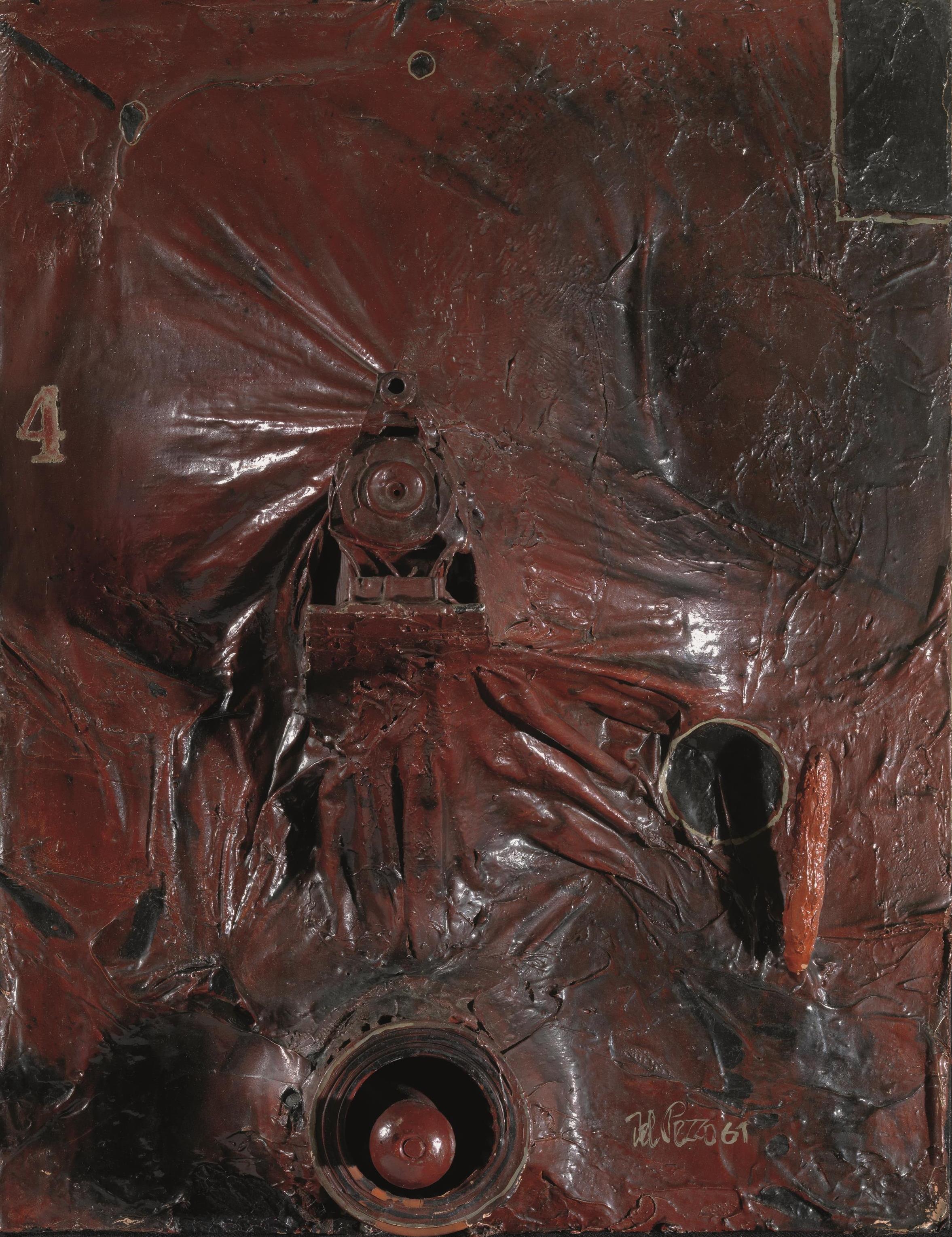 Lucio del Pezzo (Napoli 1933) IL DIABOLICO DOTTOR SCHWARZ assemblaggio polimaterico su tavola, cm 65x50 firmato e datato sul retro: titolato e datato eseguito nel 1961