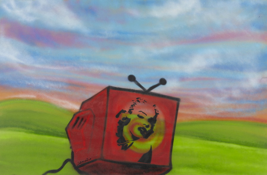 SKIM (n. 1985) MARYLIN E PAESAGGIO. Spray su masonite. Cm 118,00 x 77,00. firma