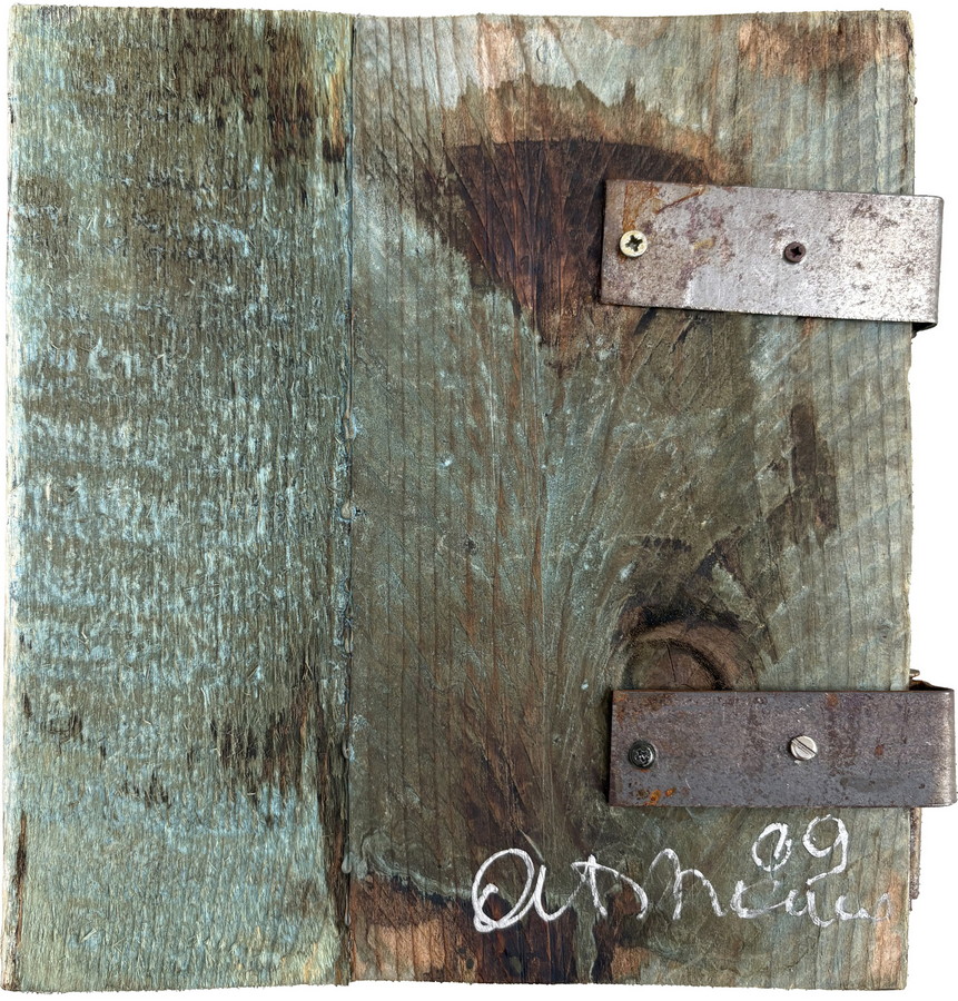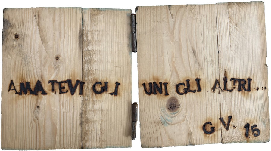 DEL DONNO ANTONIO (1927 - 2021) VANGELO - AMTEVI GLI UNI GLI ALTRI. 2009. legno inciso a fuoco su tavola. Cm 26,00 x 27,50 x 6,00. firma e data