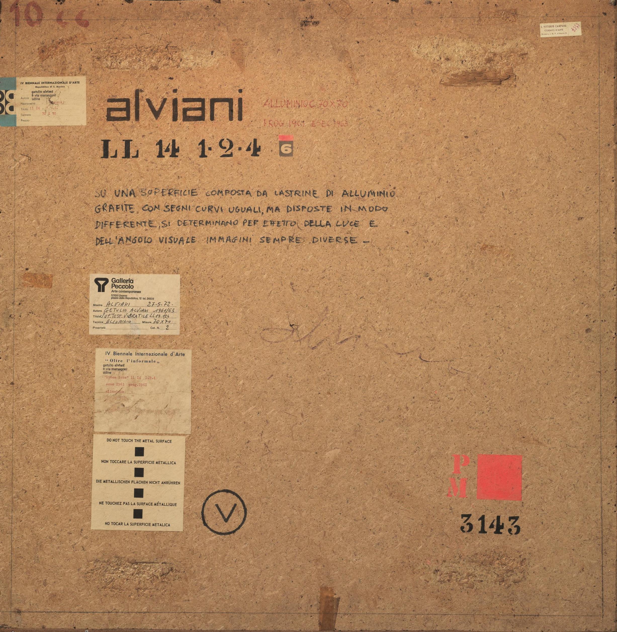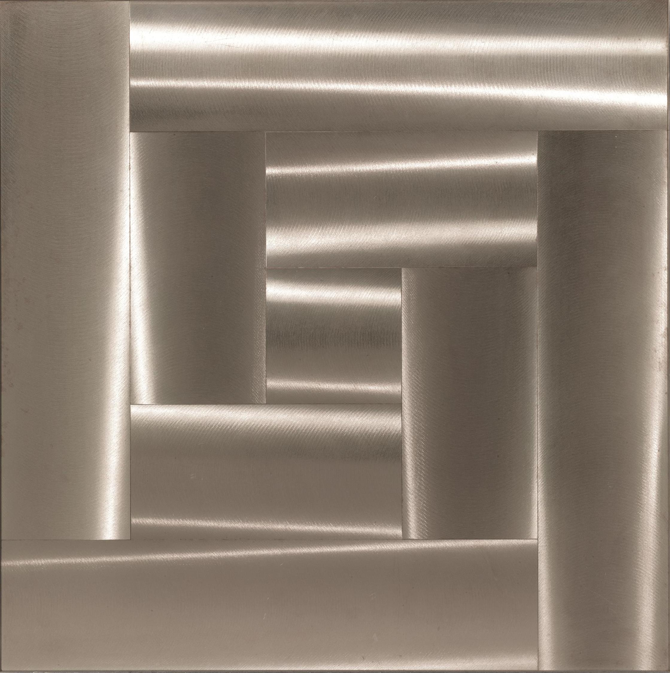 Getulio Alviani (Udine 1939) SUPERFICIE A TESTURA VIBRATILE LL 14 1-2-4 alluminio satinato su tavola, cm 70x70 sul retro: firmato e titolato eseguito nel 1961-1963 Provenienza: Galleria Peccolo, Livorno Collezione privata, Livorno Esposizioni: IV Biennale di San Marino, Oltre l'Informale, Palazzo del Kursal, luglio-ottobre 1963 Bibliografia: IV Biennale di San Marino, Oltre l'Informale, Rimini 1963, p. 27