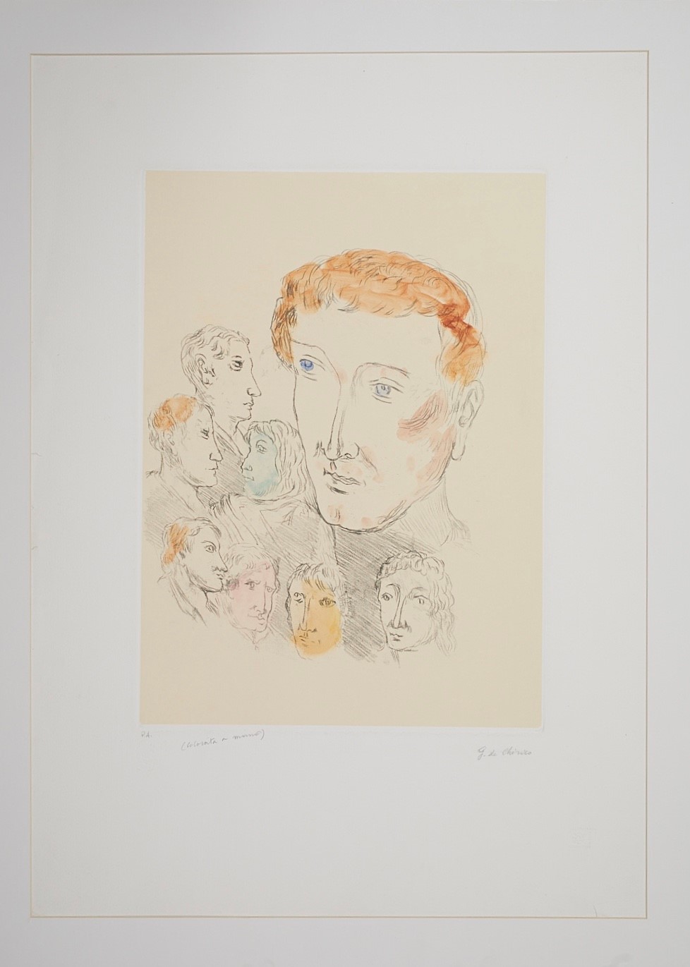 GIORGIO DE CHIRICO (Volos 1888 – Roma 1978) “Personaggi”, 1973. Incisione a vernice molle su fondo colorato, colorata a mano dall'Artista. Cm 70x50,5. Opera firmata in basso a destra G. de Chirico. Reca numeri di tiratura in basso a sinistra P.A. Reca scritta colorata a mano. Reca timbro a secco di Alberto Caprini Stampatore Roma in basso a destra. Reca timbro a secco Giorgio de Chirico in basso a sinistra.