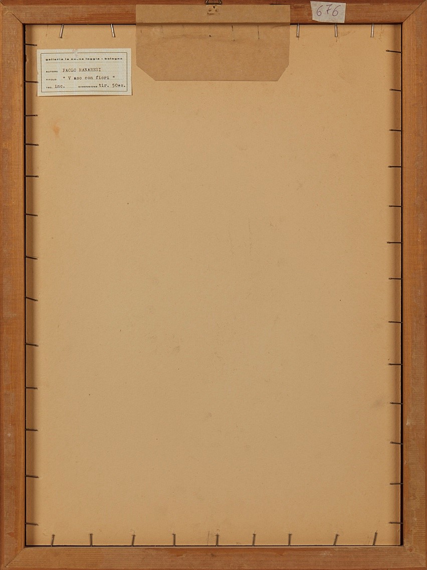 PAOLO MANARESI (Bologna 1908 - 1991) "Vaso con fiori". Incisione su carta. Cm 47,5x34. Opera firmata in basso a destra Paolo Manaresi. Reca numeri di tiratura in basso a sinistra 14/50. Al retro reca etichetta Galleria La Nuova Loggia Bologna.