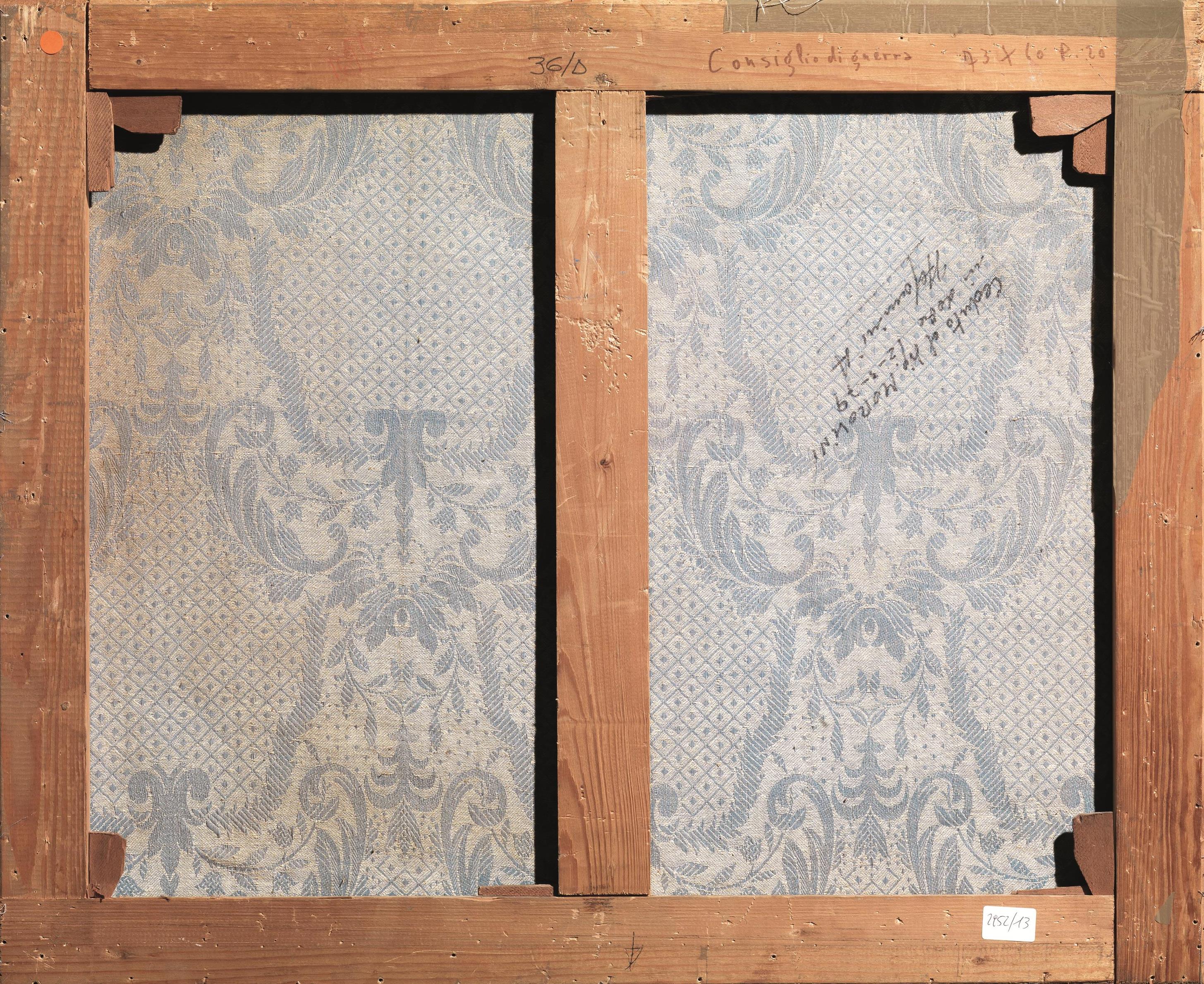 Enrico Baj (Milano 1924 - Vergiate 2003) CONSIGLIO DI GUERRA olio, collage, ovatta, passamaneria, vetri oggetti e stoffa su tela, cm 60x73 firmato sul retro: titolato Provenienza: Collezione Morosini Collezione privata Bibliografia: Enrico Crispolti, Catalogo Generale delle opere di Baj, Torino 1973, p.140, tav.955