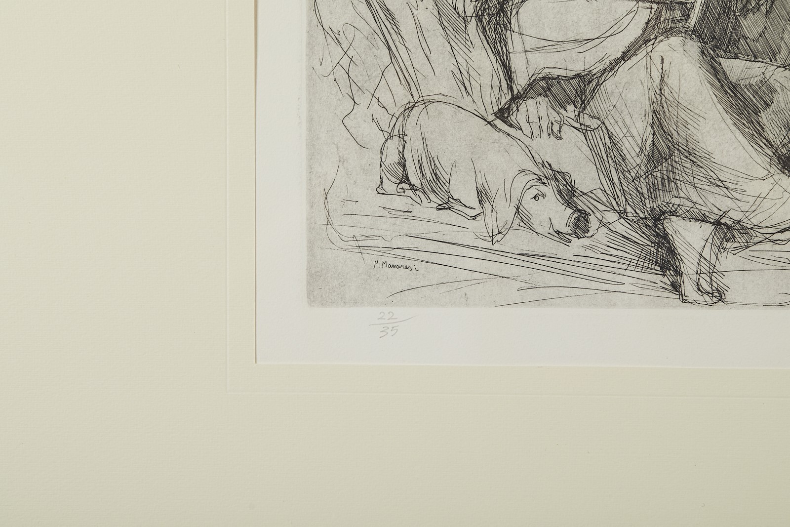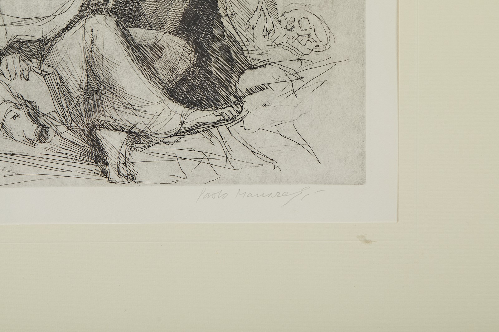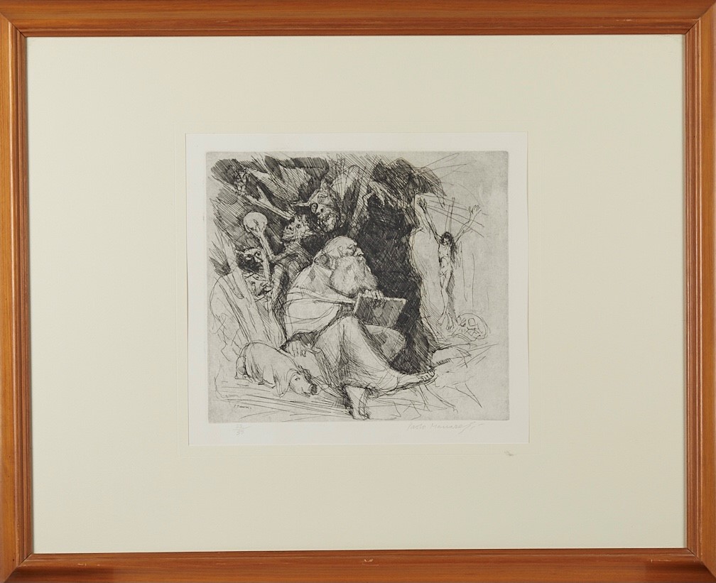 PAOLO MANARESI (Bologna 908 - 1991) "Senza titolo". Incisione su carta. Cm lastra: 28x31,5. Opera firmata in basso a destra Paolo Manaresi. Reca numeri di tiratura n basso a sinistra 22/35. Al retro reca etichetta Grafica Studio Via Farina, Bologna.