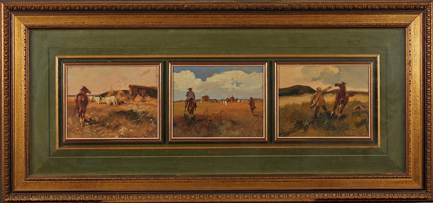 CARLO DOMENICI (Livorno 1897 - Portoferraio 1981) "Senza titolo". Lotto composto da tre opere incorniciate insieme. Olio su tavola. Misura totale cm 20x72. Cadauno cm 20x24. Tutte le opere sono firmate in basso a destra C. Domenici.