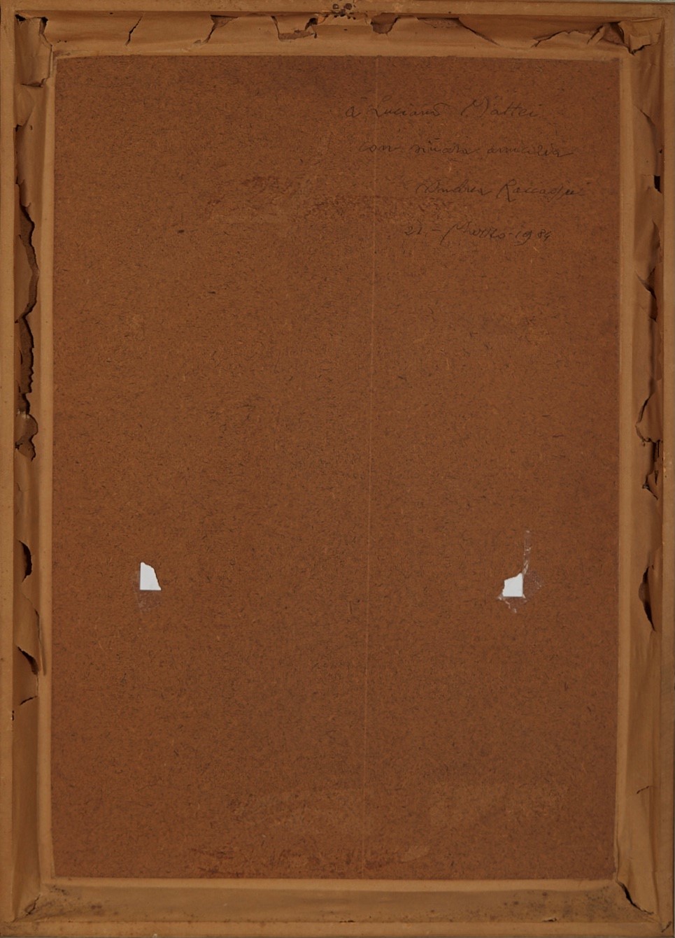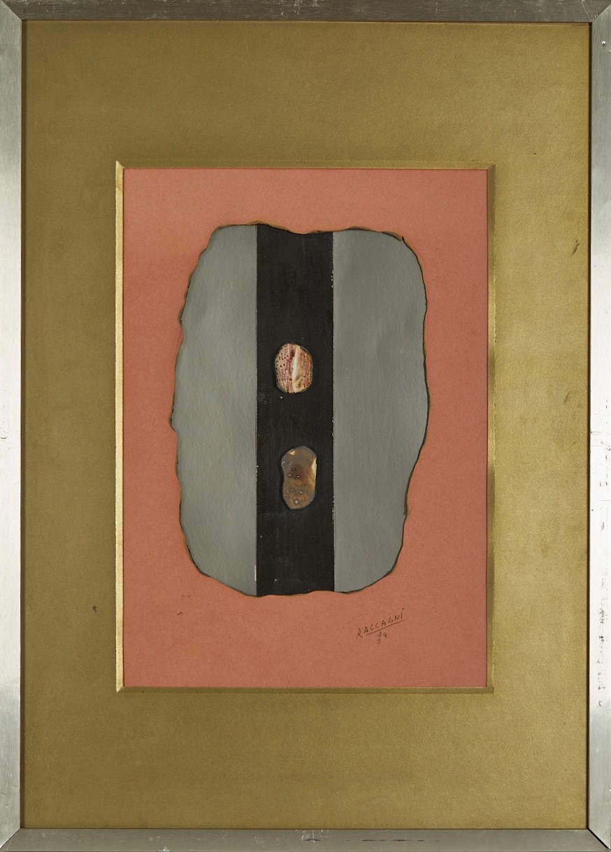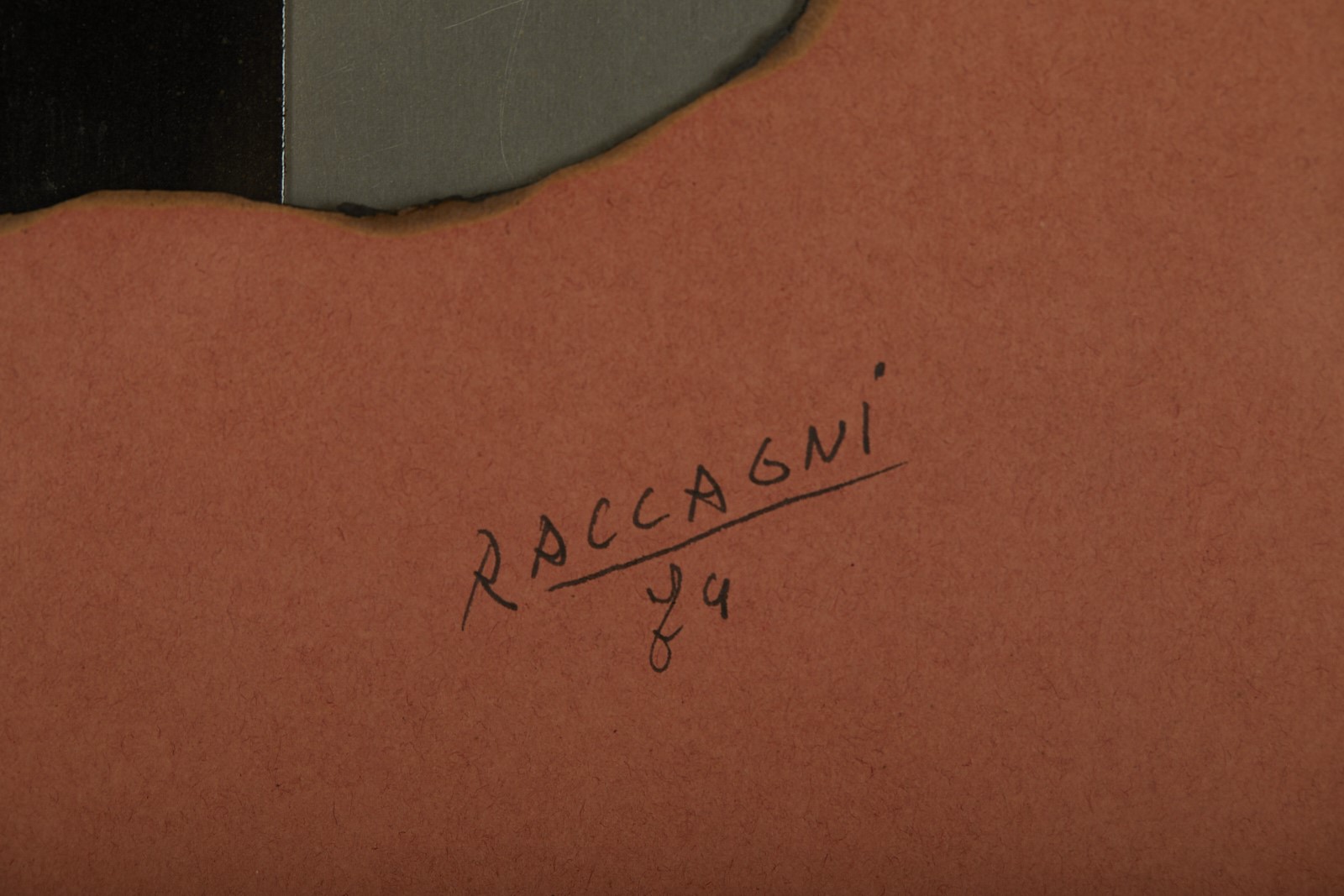 ANDREA RACCAGNI (Imola 1921 - 2005) "Senza titolo". 1974. Tecnica mista e collage su cartone. Cm 44,5x31,5. Opera firmata in basso a destra Raccagni 74. Al retro opera firmata e dedicata.