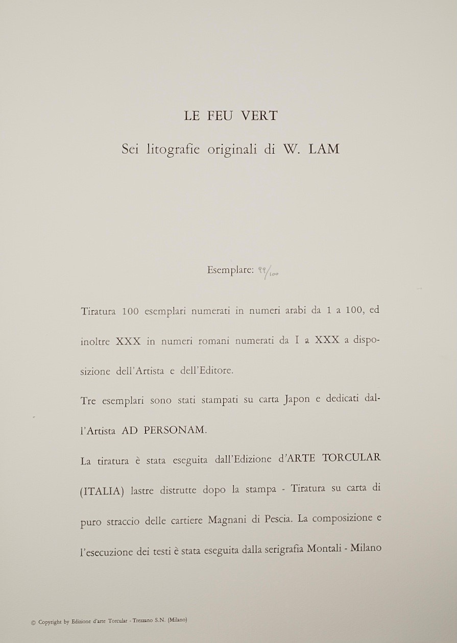 WILFREDO LAM (Sagua La Grande 1902 - Parigi 1982 ) “Le Feu Vert”. Cartella contenente sei litografie a colori. Cm foglio: 70x50 cadauno. Tutte firmate in basso a destra e numerate in basso a sinistra 99/100. Tiratura eseguita dall’Edizioni d’arte Torcular, Milano. Contenute in cofanetto originale.