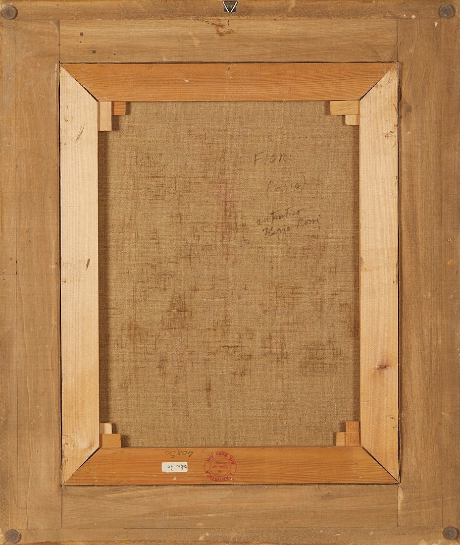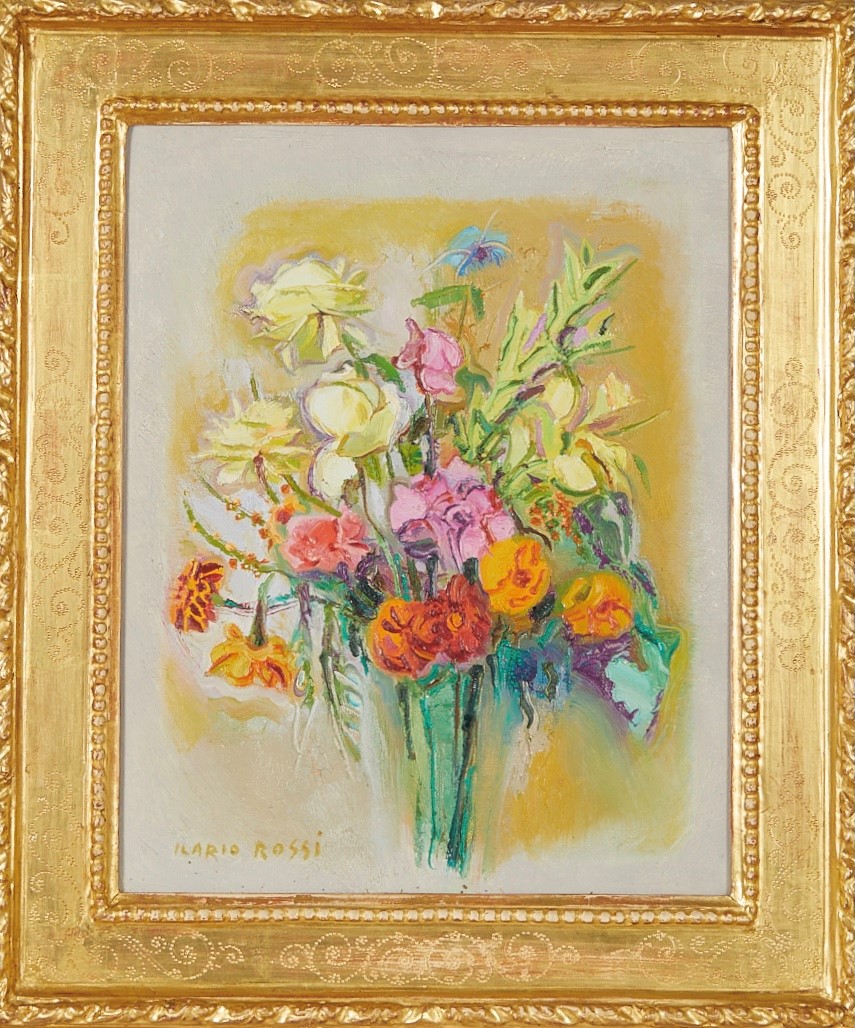 ILARIO ROSSI (Bologna 1911 - 1994) "Vaso di fiori". Anni '70. Olio su tela. Cm 50x40. Opera firmata in basso a sinistra Ilario Rossi. Al retro reca scritta per autentica Ilario Rossi. Al retro reca timbro l'Artistica Belle Arti.