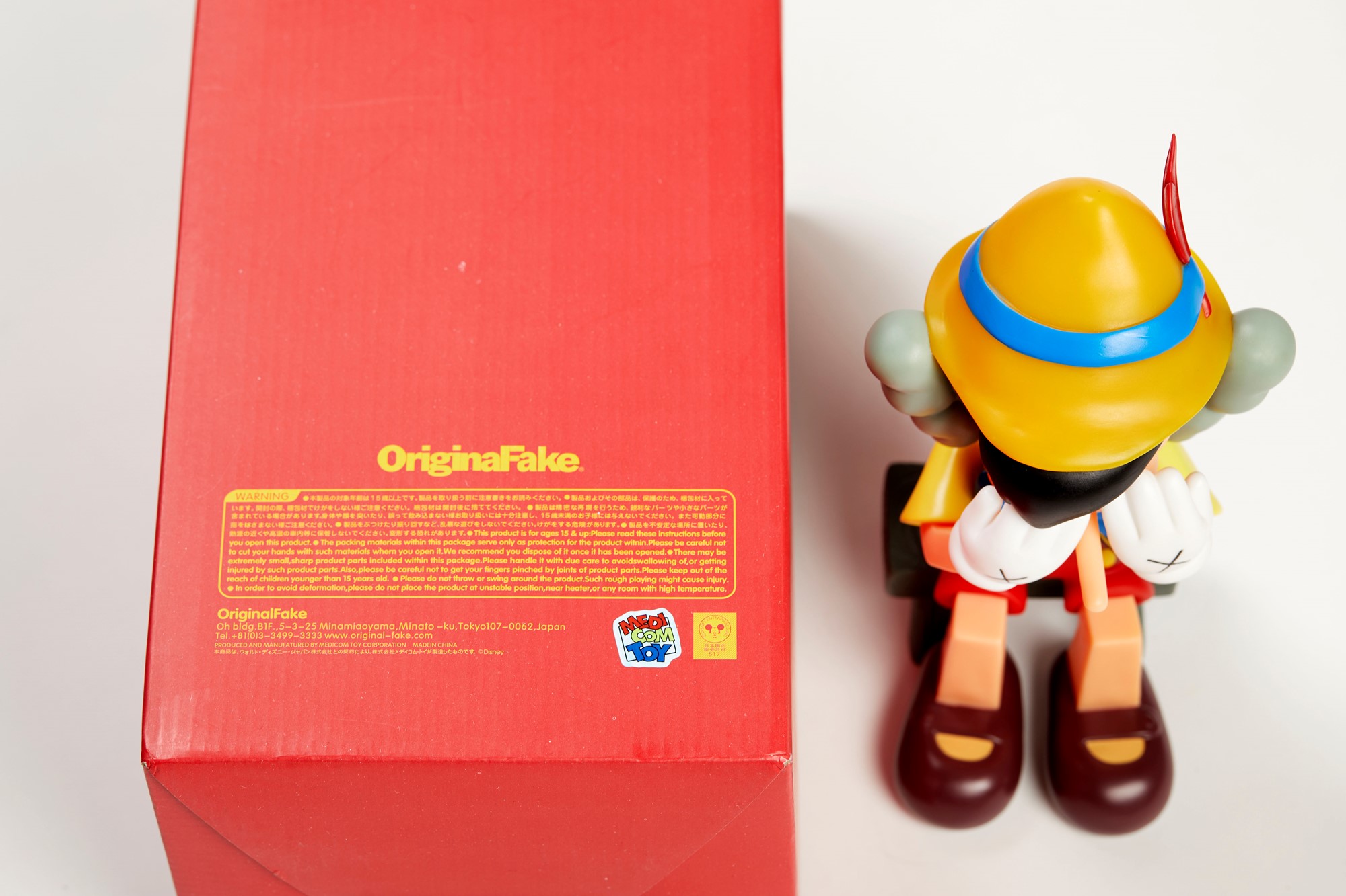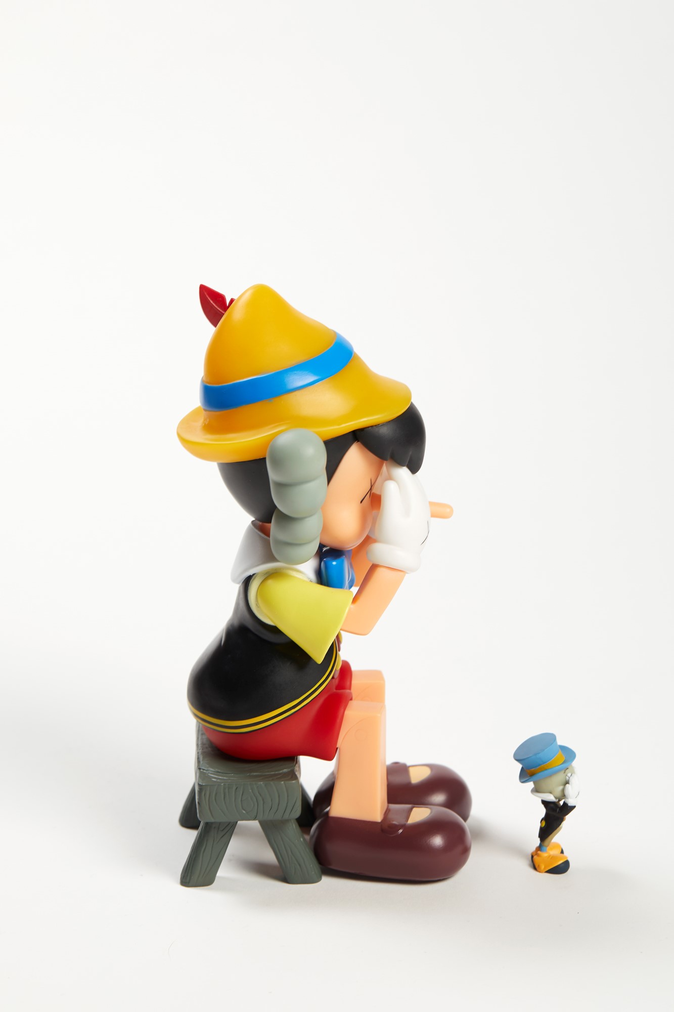 KAWS (Jersey City 1974) "Pinocchio & Jiminy Cricket", 2010. Scultura in vinile verniciato. Cm 26x12.7x11. Sotto al piede sinitro reca scritta Kaws, Disney. Sotto al piede destro Medicom Toy, 2010, Cina. Corredato di scatola originale (difetti nella scatola).