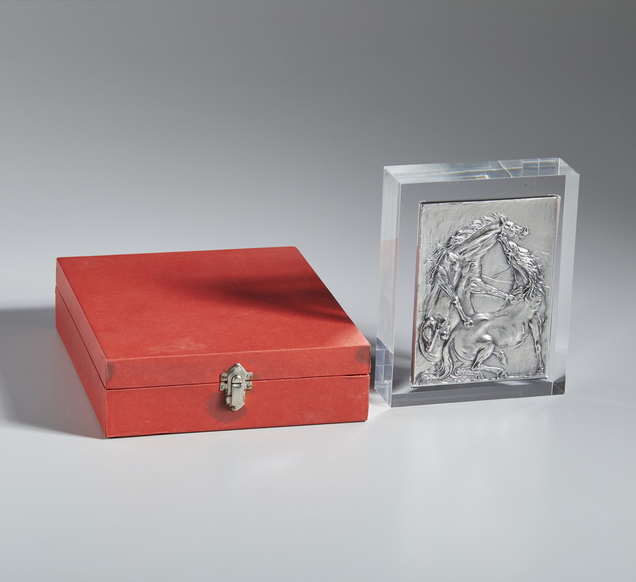 MESSINA FRANCESCO (1900 - 1995) GIOCO DI CAVALLI . bassorilievo su lastra d'argento. Cm 13,00 x 16,50 x 4,00. firma e tiratura, es. p.a.