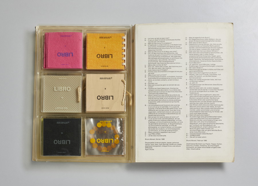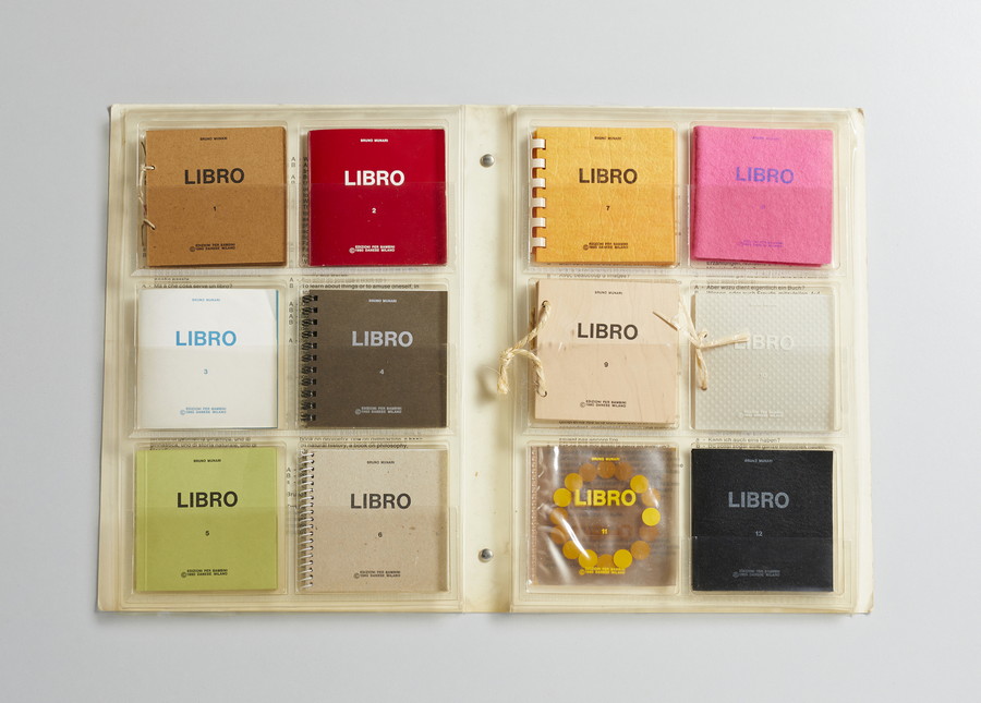 MUNARI BRUNO (1907 - 1998) I PRELIBRI. 1980. Libro d'arte. Cm 25,50 x 36,50. L'opera si presenta con la sua custodia originale contenente 12 libri di differenti materiali (carta, cartoncino, cartone, legno, panno spugna, friselina, plastica trasparente) ognuno rilegato in modo diverso con uguali dimensioni: 10x 10 cm