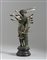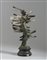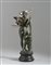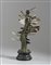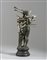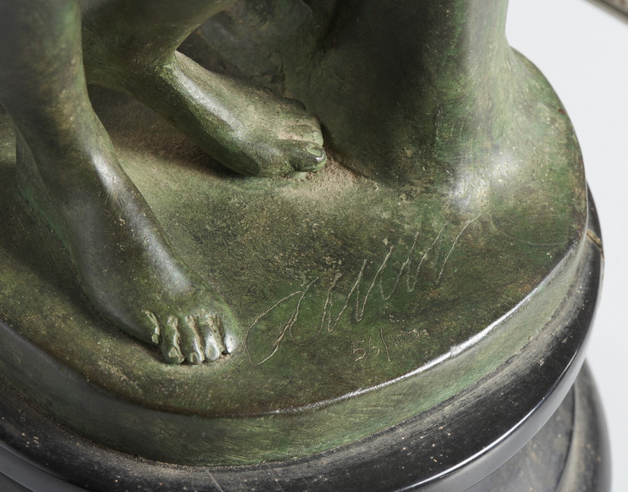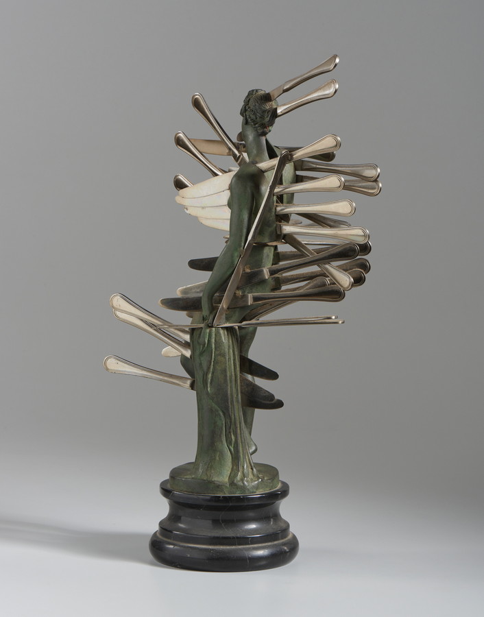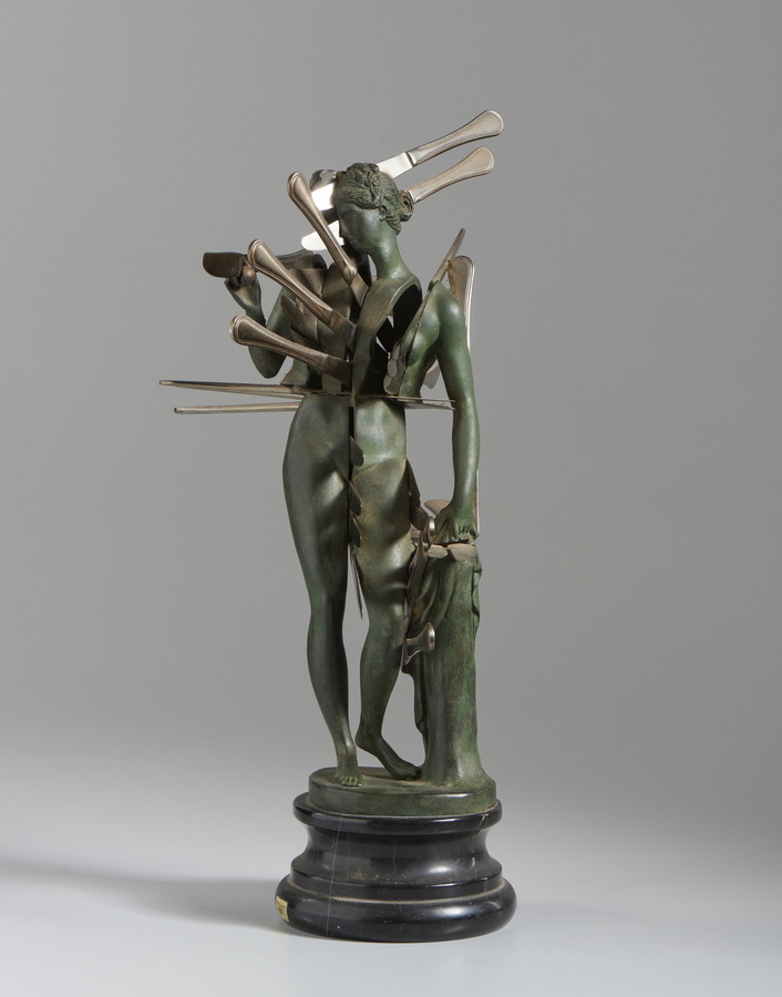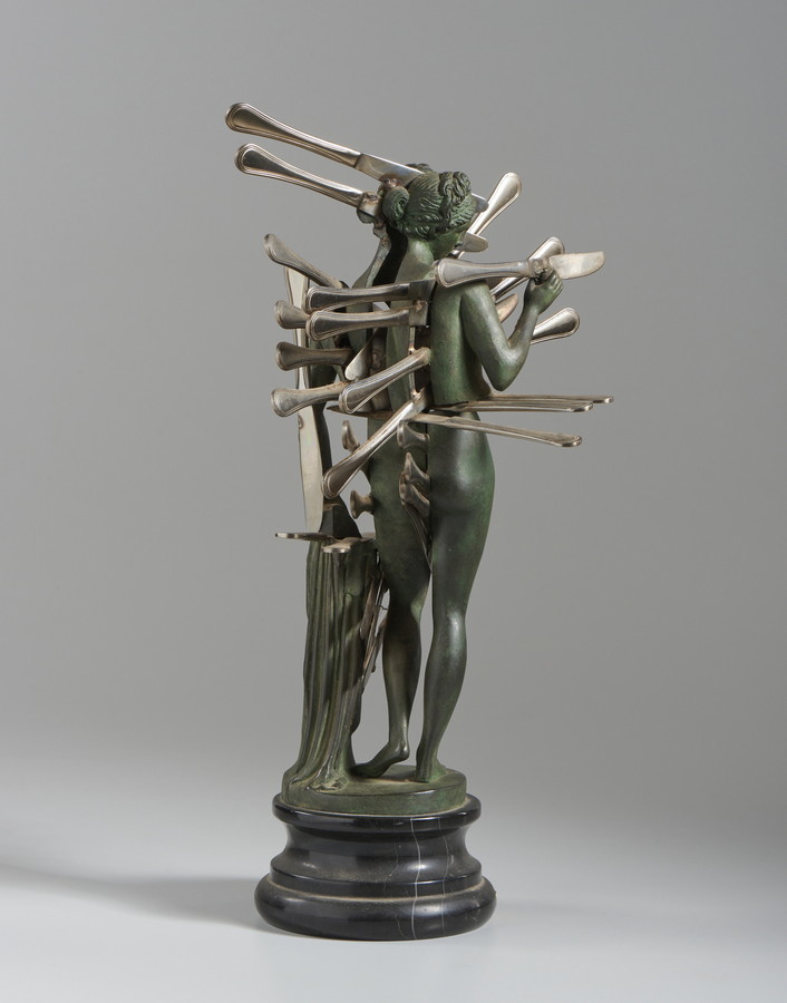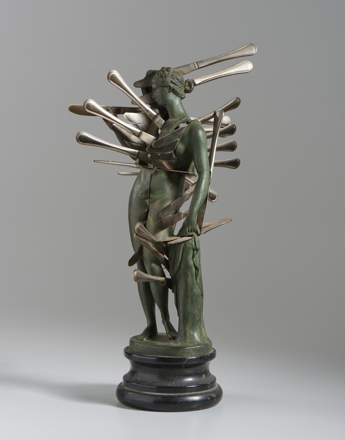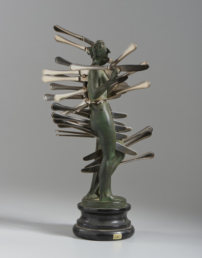 ARMAN FERNANDEZ (1928 - 2005) MADEMOISELLE EST SERVIE (ANNI'90). Taglio di una statuetta e accumulo di coltelli assemblati, bronzo saldato, dipinto di verde e bordo del taglio lucidato o dipinto a specchio. Cm 36,00 x 60,00 x 27,00. firma incisa alla base, es. 56/100