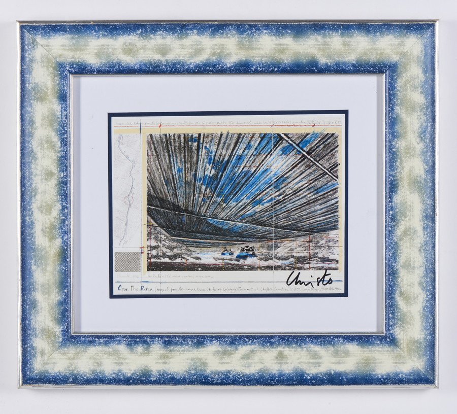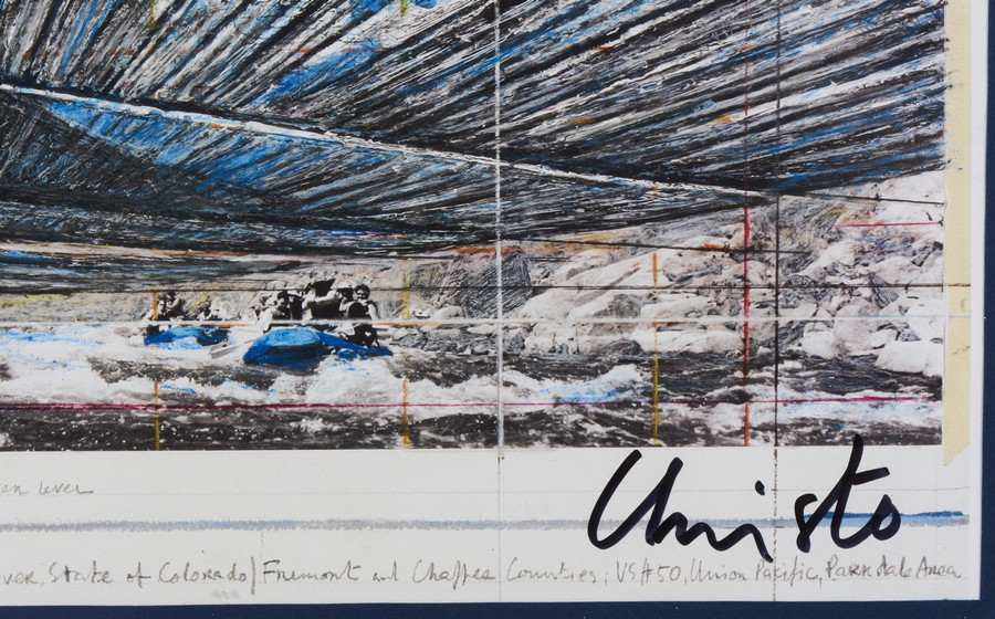 CHRISTO' (n. 1935) & JEANNE-CLAUDE (1935 - 2009) OVER THE RIVER (PROJECT FOR ARKANSAS RIVER, STATE OF COLORADO) . Intervento su cartolina. Cm 33,00 x 25,50. firma
