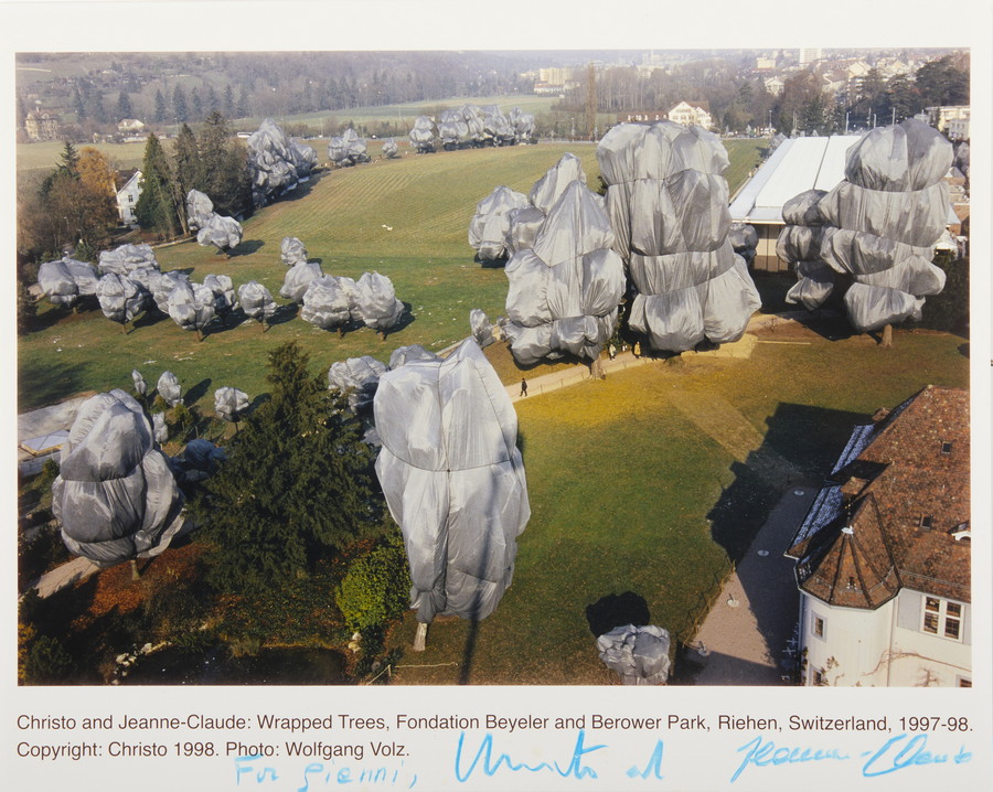 CHRISTO' (n. 1935) & JEANNE-CLAUDE (1935 - 2009) WRAPPED TREES . 1998. Intervento su fotografia. Cm 25,50 x 20,20. firma e dedica ad personam a matita