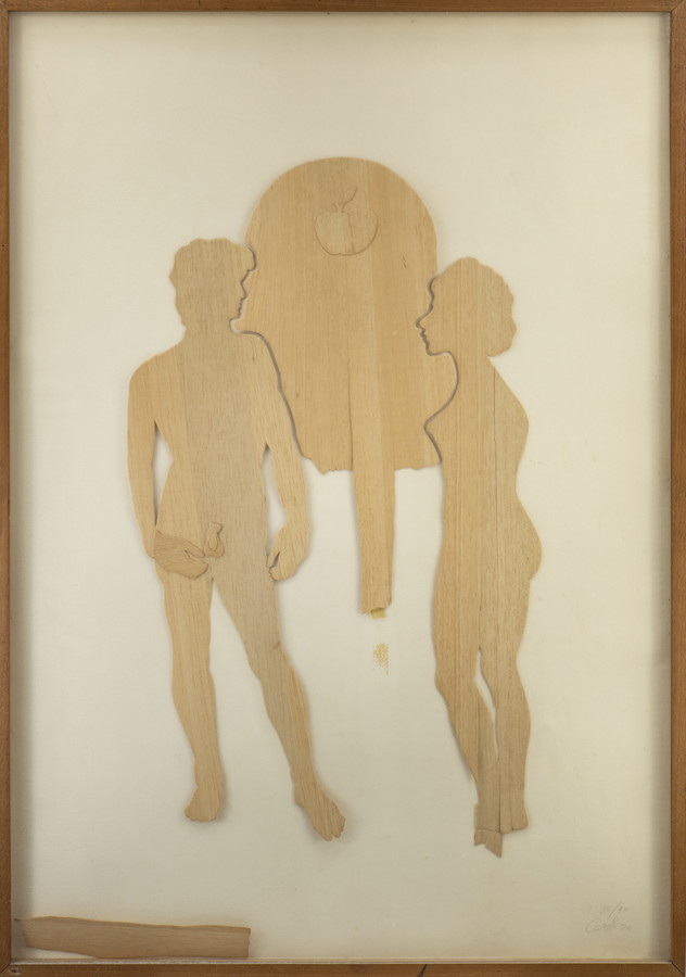 CEROLI MARIO (n. 1938) ADAMO ED EVA. 1970. multiplo in legno applicato su cartoncino. Cm 70,00 x 100,00. firma, titolo e data a matita, es. 86/90