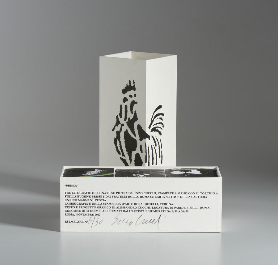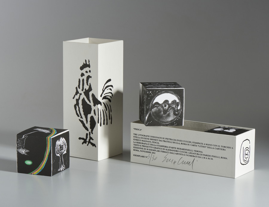 Tre litografie, su cubi, disegnate su pietra da Enzo Cucchi, stampate a mano con il torchio a stella Eugene Brisset dai f.lli Bulla, Roma su carta "litho2 della cartiera Enrico Magnani, Pescia.
