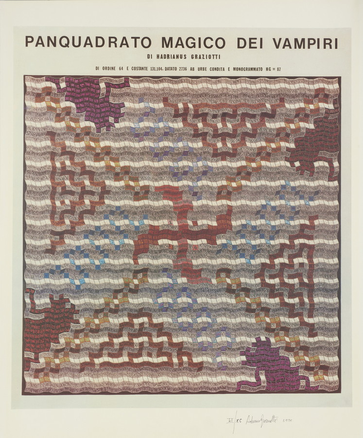 GRAZIOTTI UGO ADRIANO (1912 - 2000) PANQUADRATO MAGICO DEI VAMPIRI. 1995. Litografia offset. Cm 72,00 x 87,00. firma, data e tiratura a penna, es. LI/XC