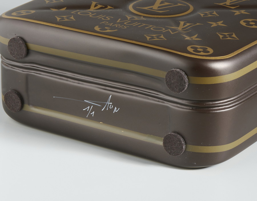 SALIN ERIK (n. 1960) JERRYCAN VUITTON LOGO. Resina poliestere, vernice poliuretanica, pelle, fibbia in metallo. Cm 24,50 x 27,50 x 9,00. sotto la base: firma e tiratura, es. 1/1