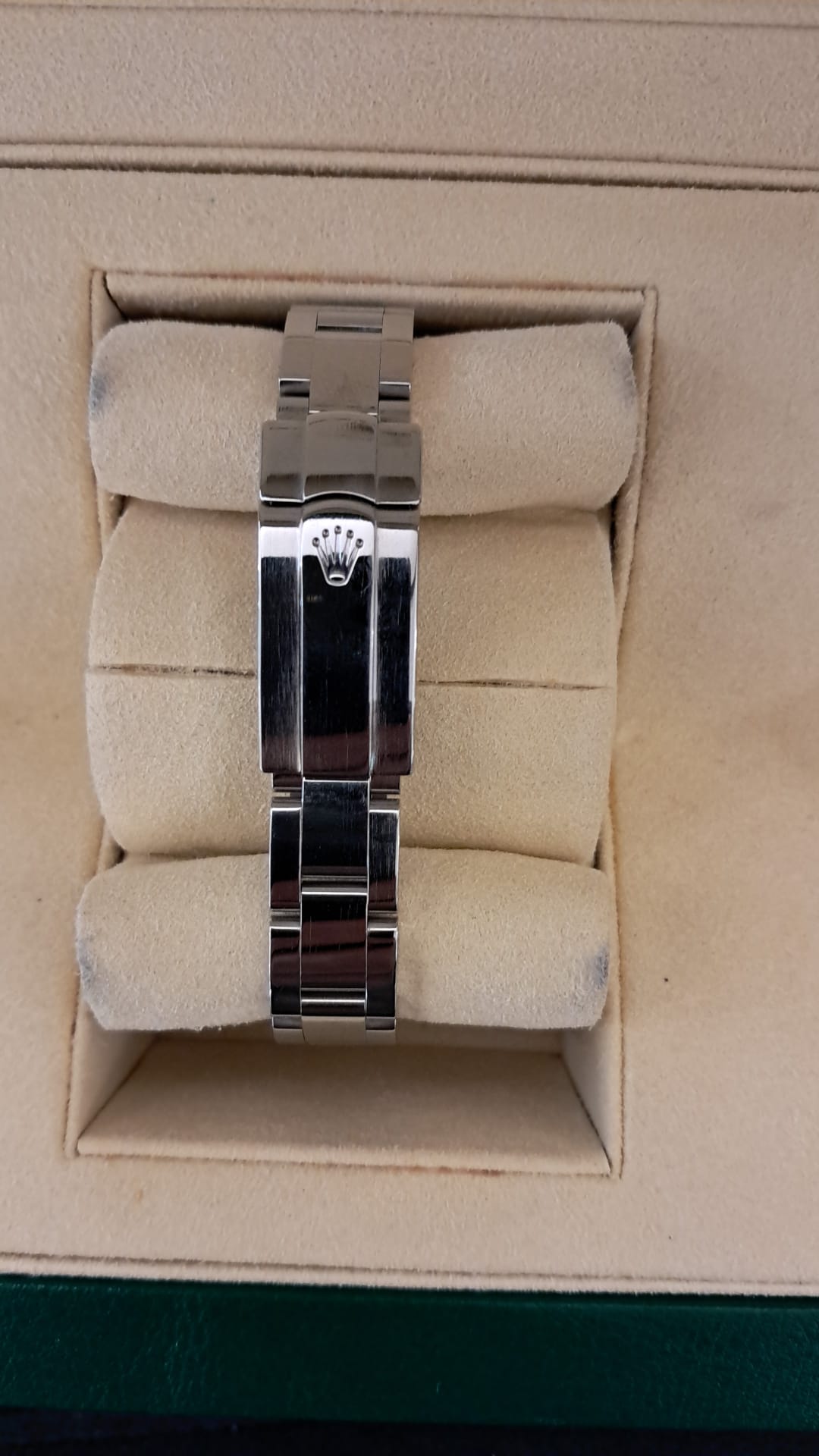 Marca Rolex Modello (Orologio) Oyster Perpetual 26 Numero di referenza 176200 Carica Automatico Materiale della cassa Acciaio Materiale cinturino Acciaio Anno di produzione 2015 Condizione Ottimo Corredo Documenti originali, no box Diametro 26 mm Materiale lunetta Acciaio Vetro Vetro zaffiro Numeri sul quadrante Arabi Cinturino Materiale cinturino Acciaio Colore cinturino Acciaio Chiusura Déployante Materiale chiusura Acciaio - COMMISSIONE D’ASTA 25%