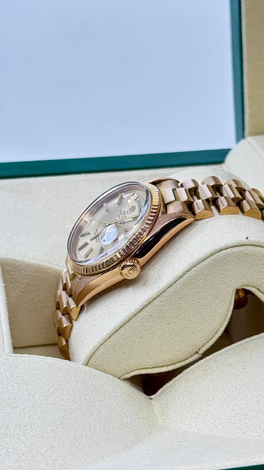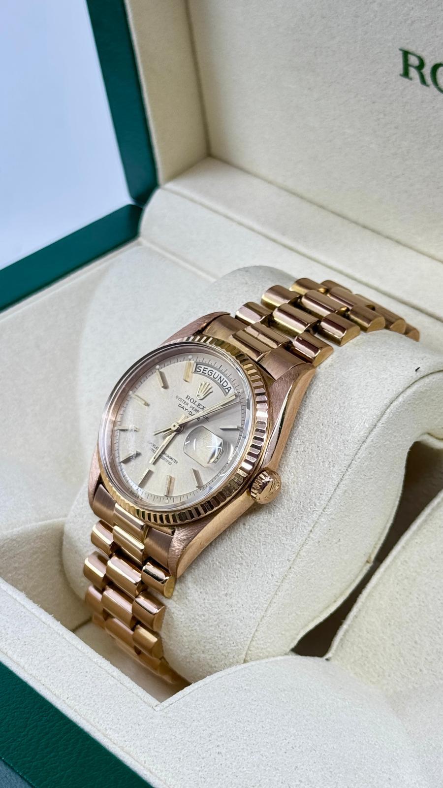 Marca Rolex Modello (Orologio) Day-Date 36 Numero di referenza 1803 Carica Automatico Materiale della cassa Oro giallo Materiale cinturino Oro giallo Fine anno 60 Condizione Usato (Ottimo) L'articolo presenta segni di usura lievi, come ad esempio graffi leggeri, ma non percepibili al tatto. Corredo Senza scatola e documenti, revisione da laboratorio interna effettuata nel 2025 Carica Automatico Cassa Materiale della cassa Oro giallo Diametro 36 mm Impermeabile 10 ATM Materiale lunetta Oro giallo Vetro Vetro plexi Cinturino Materiale cinturino Oro giallo Colore cinturino Oro Materiale chiusura Oro giallo - COMMISSIONE D’ASTA 25%