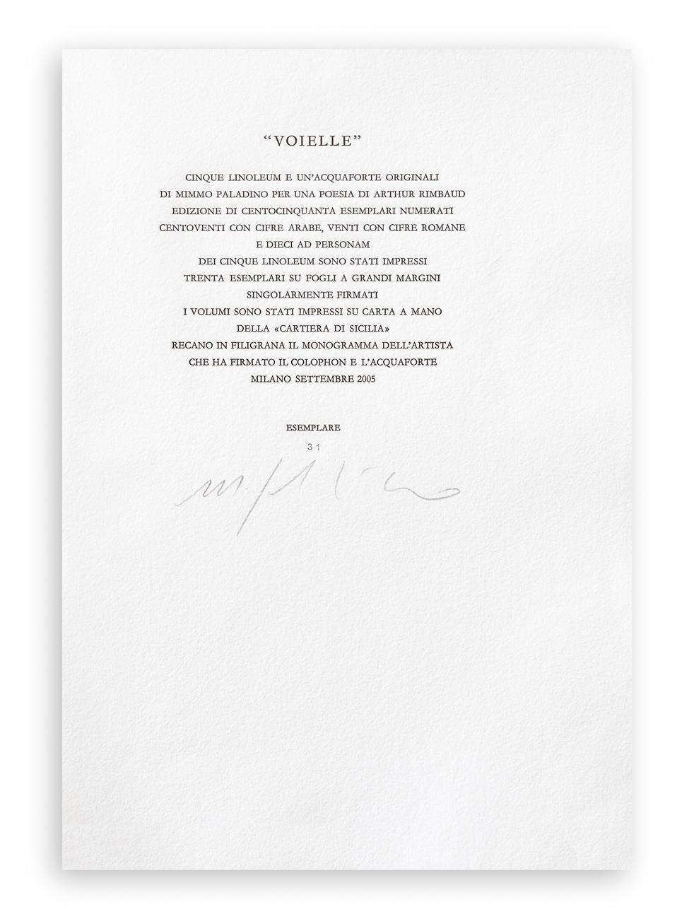 Edizione complessiva di 120 copie in numeri arabi + XX copie in numeri romani e 10 copie ad personam (Esemplare 31 recante firma dell'Artista a matita sul colophon)