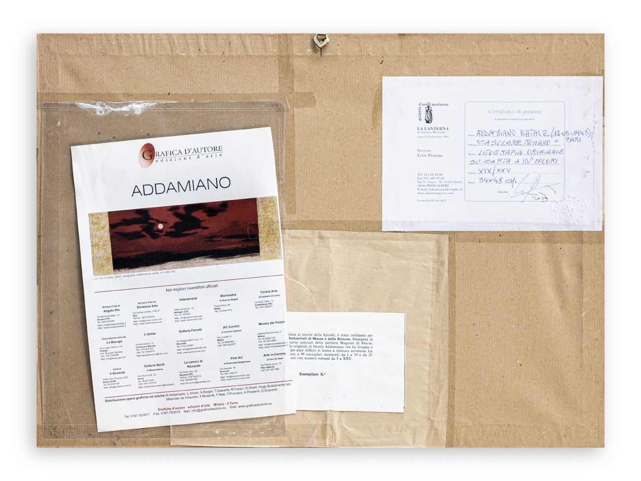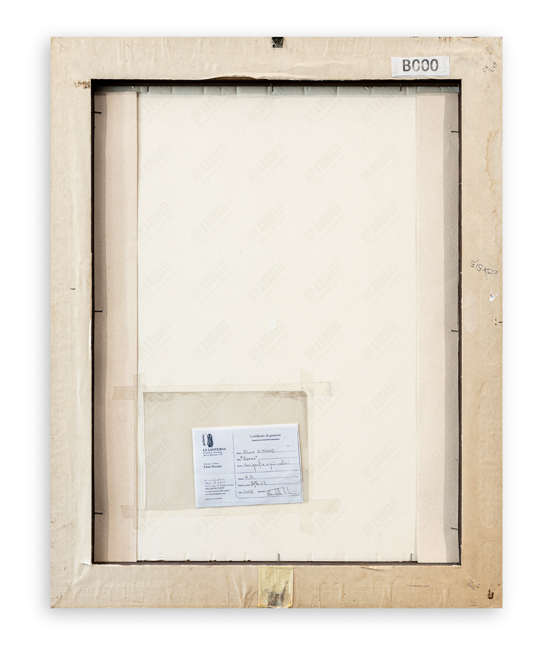 Certificato di garanzia a cura della Galleria La Lanterna (TO) al retro del cartoncino protettivo