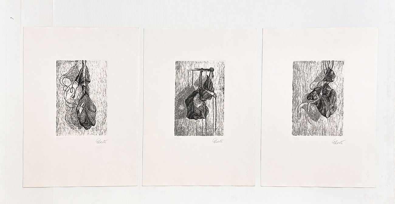 Cartella contenente 3 acqueforti, ciascuna recante firma e numerazione (Esemplari 33/50) a matita al fronte