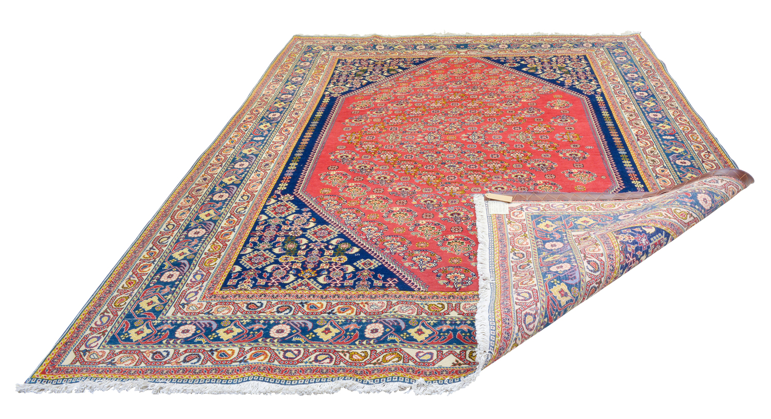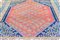 Sul campo a fondo blu, è appoggiato un grande medaglione a esagono allungato di colore rosso, contenente motivi boteh floreali nello stile tipico dei tappeti Qashqa’i.