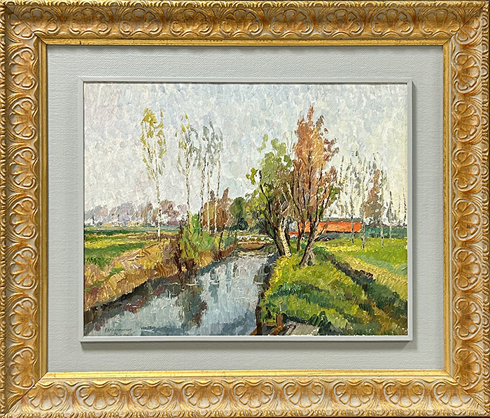 EMILIO KALCHSHMIDT, "Campagna pavese", 1974, olio su tavola, dim. 48x38 cm. Al fronte: firma e anno in basso a sinistra. Al verso: etichetta con informazioni. Opera con cornice