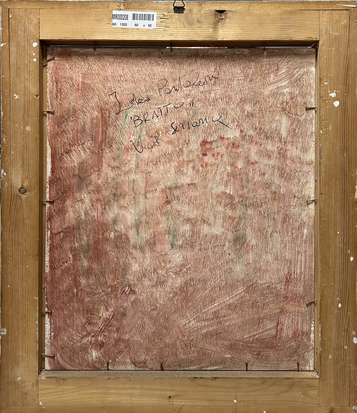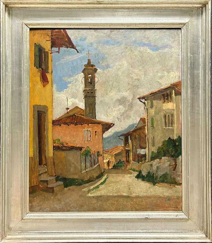 IDEO PANTALEONI, "Bratto, Val Seriana", olio su tela, dim. 60x50 cm. Al fronte: firma in basso a destra. Al verso: firma, titolo in alto al centro. Opera con cornice