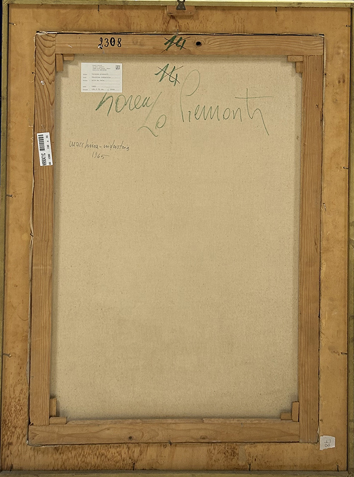 LORENZO PIEMONTI, "Macchina industria", 1965, olio su tela, dim. 100x70 cm. Al verso: firma, titolo e anno. Certificato con etichetta con informazioni. Opera accompagnata da autentica su foto dell'artista. Opera con cornice