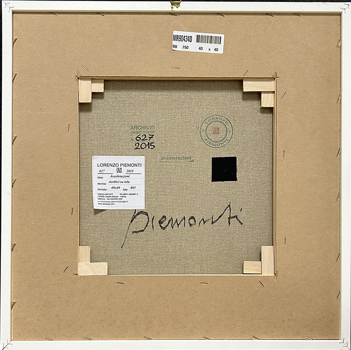 LORENZO PIEMONTI, "Accelerazioni", 2015, acrilico su tela, dim. 40x40 cm. Al verso: firma, numero di archivo e timbro ed etichetta con informazioni. Opera archiviata al N°627-2015. Opera con cornice