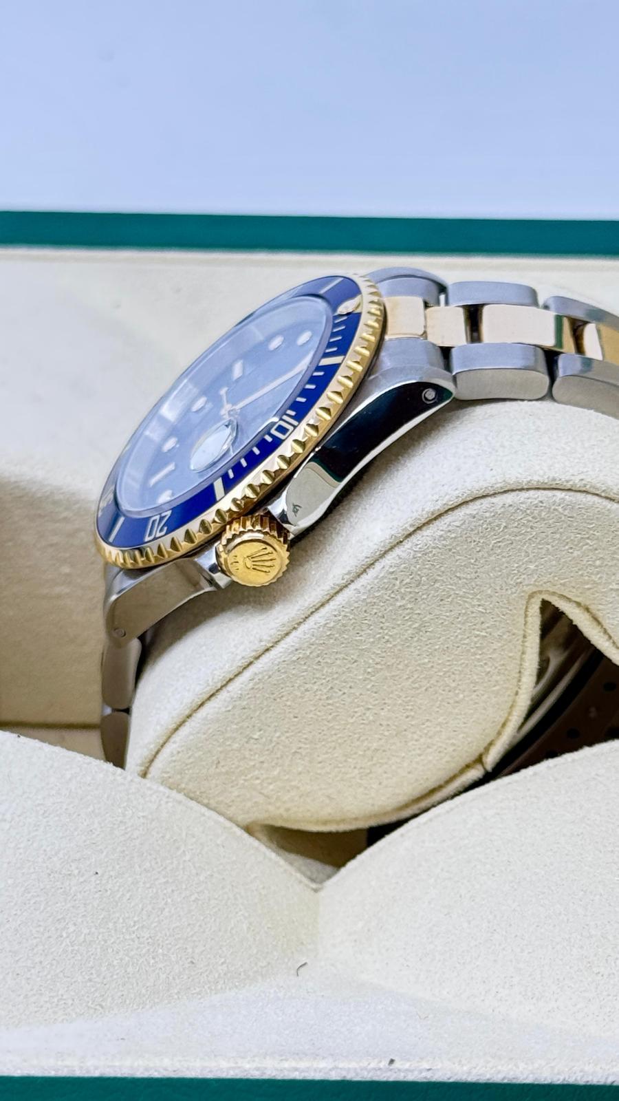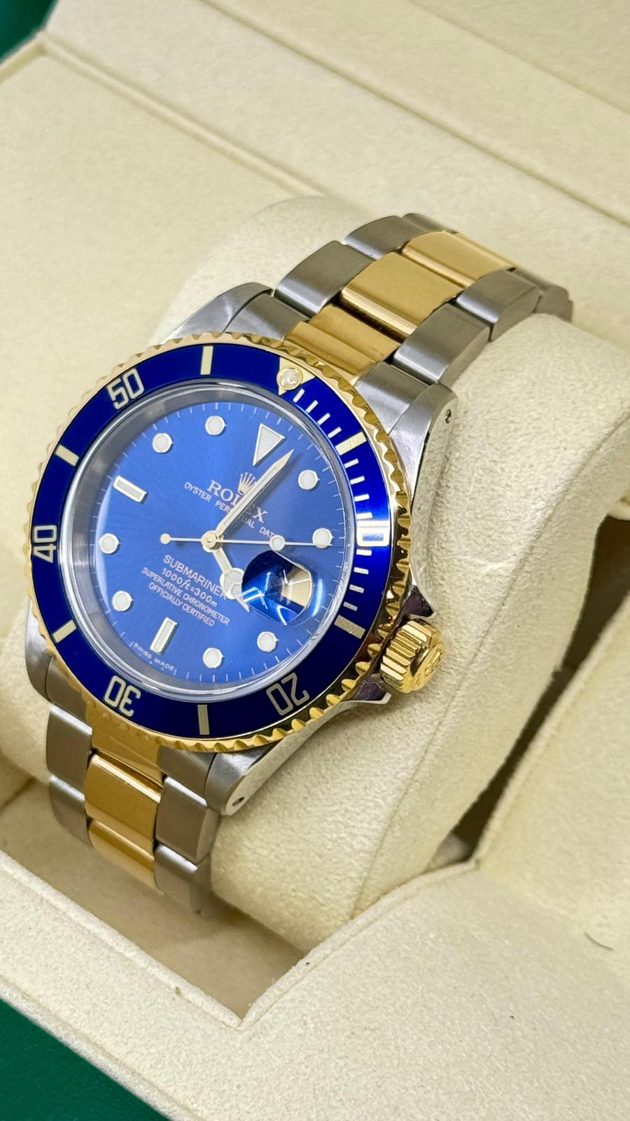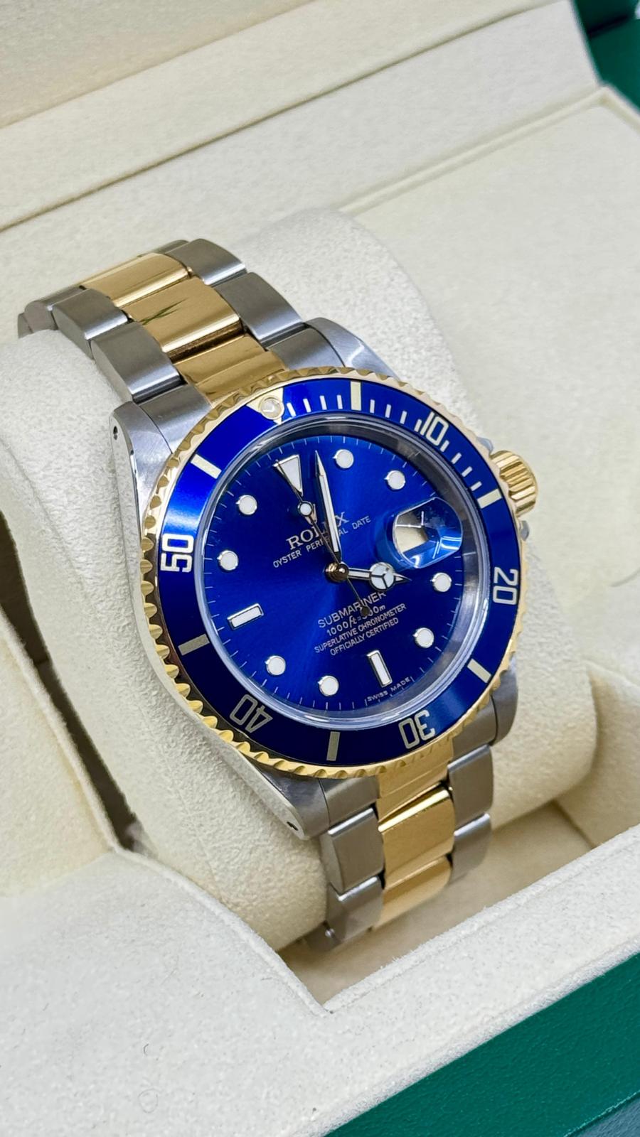 Marca Rolex Modello (Orologio) Submariner Date Numero di referenza 16613 Carica Automatico Materiale della cassa Oro/Acciaio Materiale cinturino Oro/acciaio Anno 2000 Condizione Usato (Ottimo) L'articolo presenta segni di usura lievi, come ad esempio graffi leggeri, ma non percepibili al tatto. Corredo documenti originali, no box la scatola è utilizzata solo per foto non in vendita Materiale della cassa Oro/Acciaio Diametro 40 mm Impermeabile 30 ATM Materiale lunetta Oro giallo Vetro Vetro zaffiro Quadrante blu Materiale cinturino Oro/acciaio Colore cinturino Oro/acciaio Chiusura Déployante Funzioni Data - COMMISSIONE D’ASTA 25%