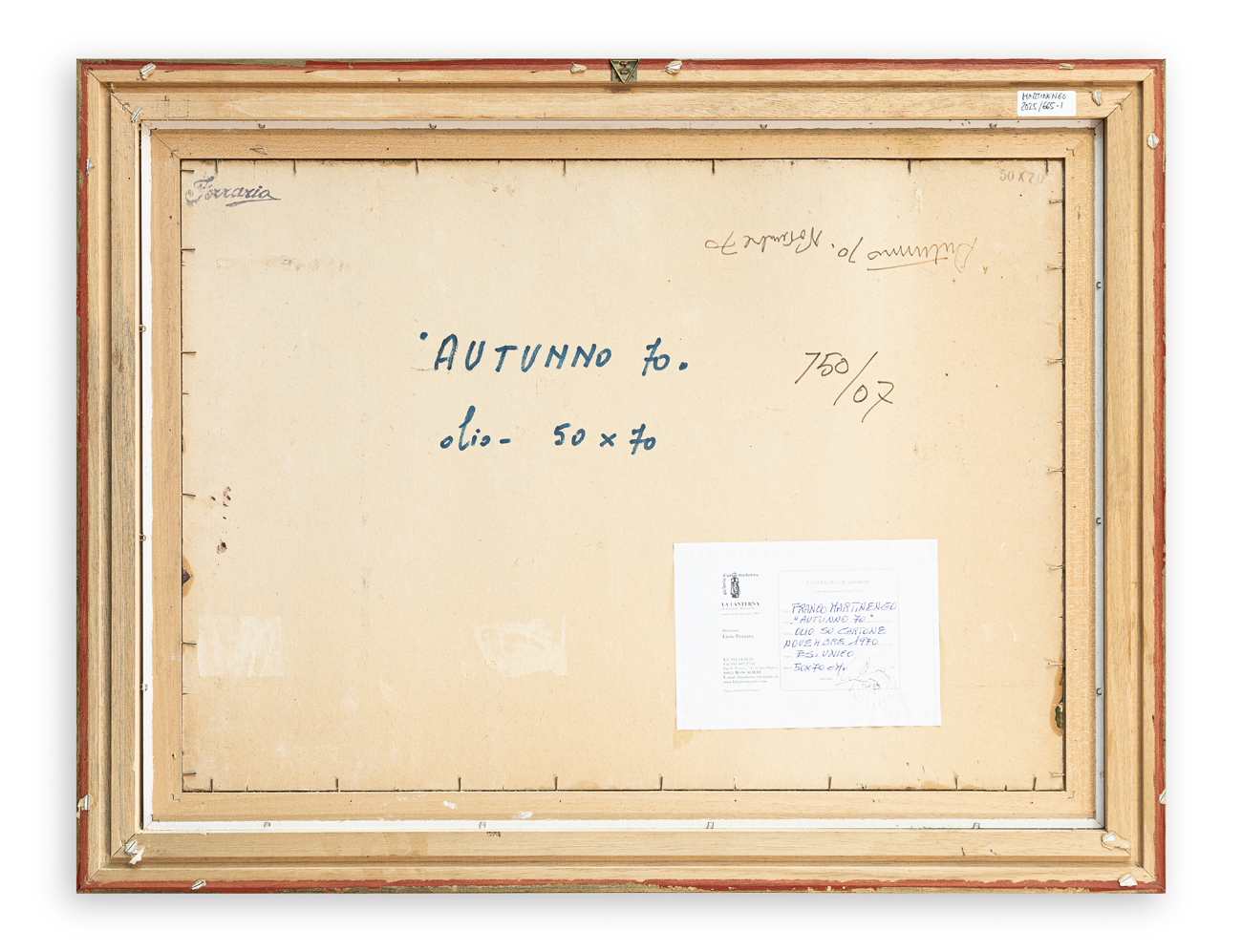 Certificato di garanzia a cura della Galleria La Lanterna (TO) al retro