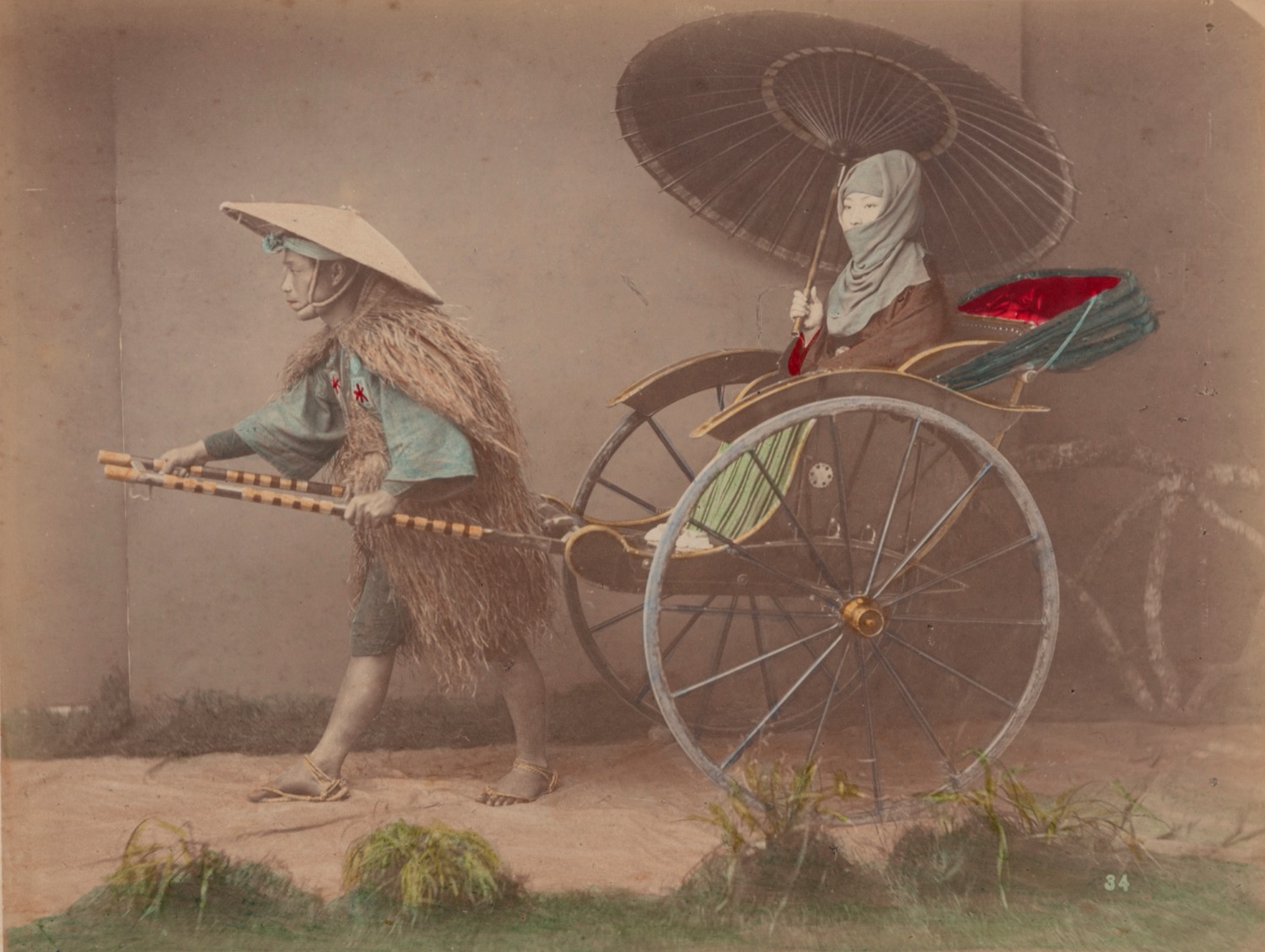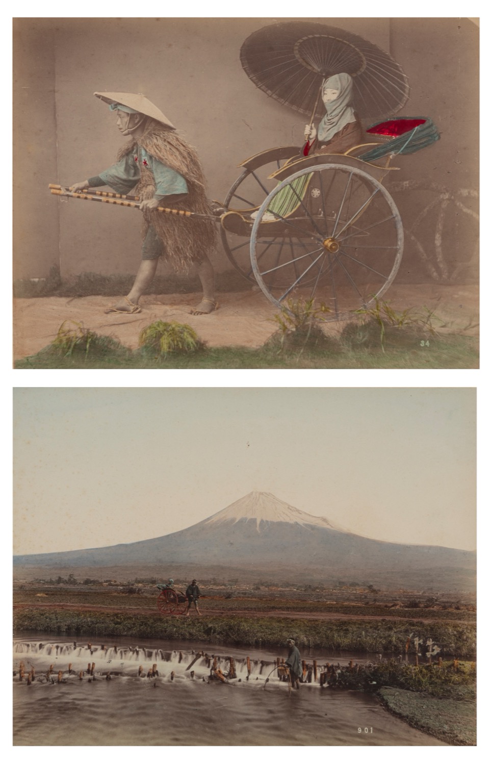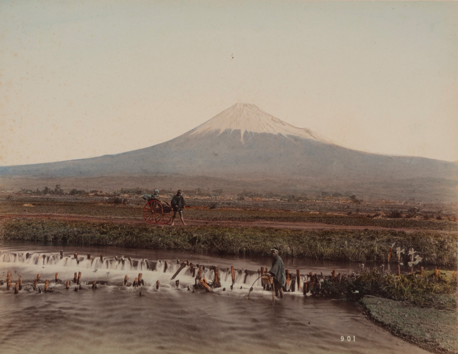 Kimbei Kusakabe (attribuito a) (1841 - 1934) - Fujiyama from Maita Village, At Tokaido ; Jinrikishia, 1890s/1900s