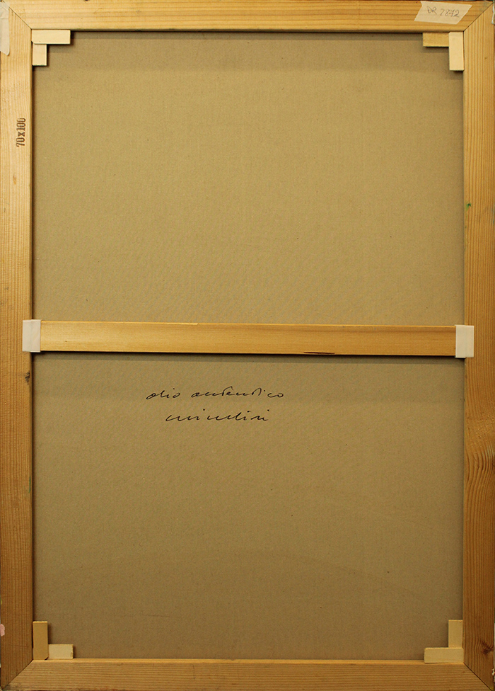 REMO BRINDISI, "Figura", anni '90, olio su tela, 100x70x1 cm, peso 1,5 kg, autentica su foto dell'artista, opera con certificato di provenienza della Galleria Pace al numero A1621. Al fronte: firma in basso a destra. Al verso: dichiarazione di autenticità da parte dell'artista al centro. Opera con certificato di provenienza della Daliano Ribani Arte. Opera senza cornice.