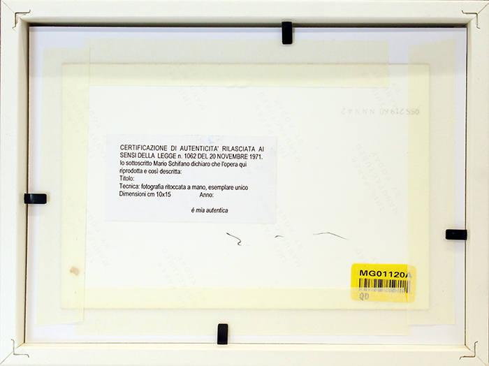 MARIO SCHIFANO, Senza titolo, 1990-1997, fotografia dipinta a mano, dim. 10x15 cm. Al verso: scheda descrittiva e firma dell'autore. Opera archiviata presso l'Archivio generale dell'Opera di Mario Schifano al N°F90-97/7413 in data 19/10/2007 a Roma. Opera pubblicata sul Catalogo Fondazione M.S Multistudio alla pag. 325 del volume V e sul Catalogo Fotografie Ritoccate alla pag. 151 del volume I. Opera con cornice